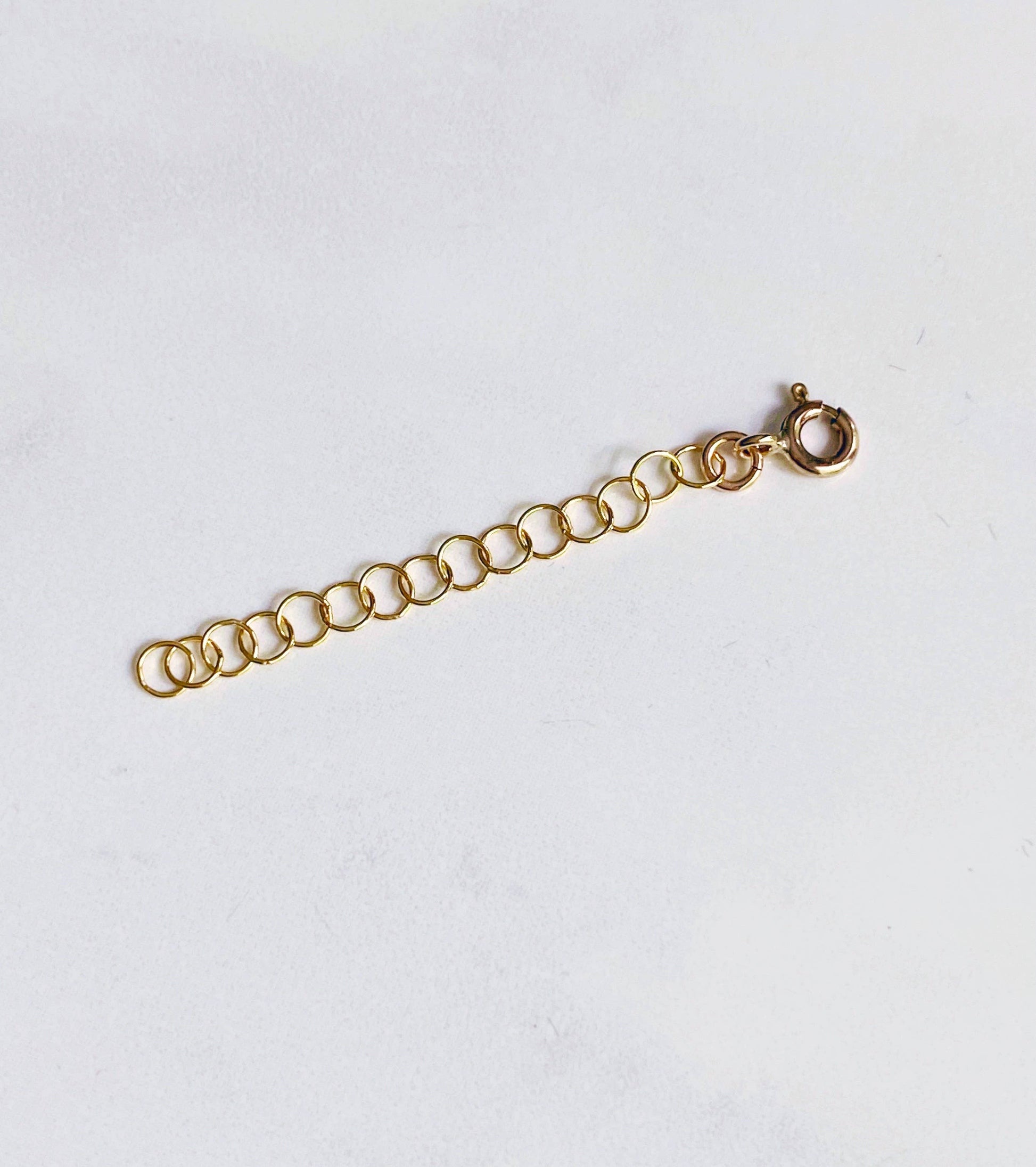 This versatile necklace accessory will allow you to wear your necklace at various lengths. The clasp is a 14kt gold filled spring ring and the chain is 14kt gold filled round cable chain. The extender is 2 inches long.