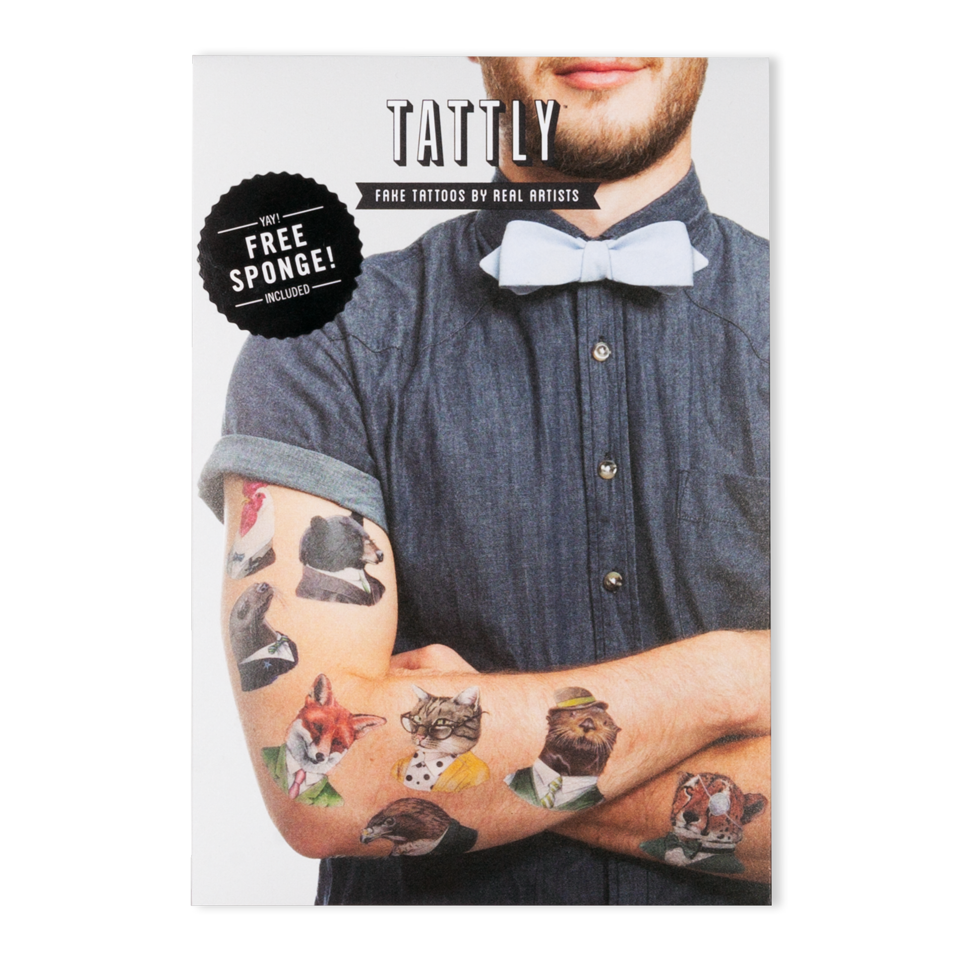 The Animal Society Set is filled with 1 of each 8 Tattly designs: Sea Otter, Tabby Cat, Cheetah, Black Bear, Red Fox, Sea Lion, Hawk, and Red Rooster. Each set includes 8 Tattlys and comes packaged in our card stock sleeve with a full-color photo on the front and a single sponge. Animal Society Set by Berkley Illustration from Tattly Temporary Tattoos. Quality, non-toxic and made in the USA. Fake tattoos by real artists! Tattly Sets feature 8 tattoos of various shapes and sizes and a sponge packaged in a sturdy card stock envelope. Envelope measures 4.25"x6.25".