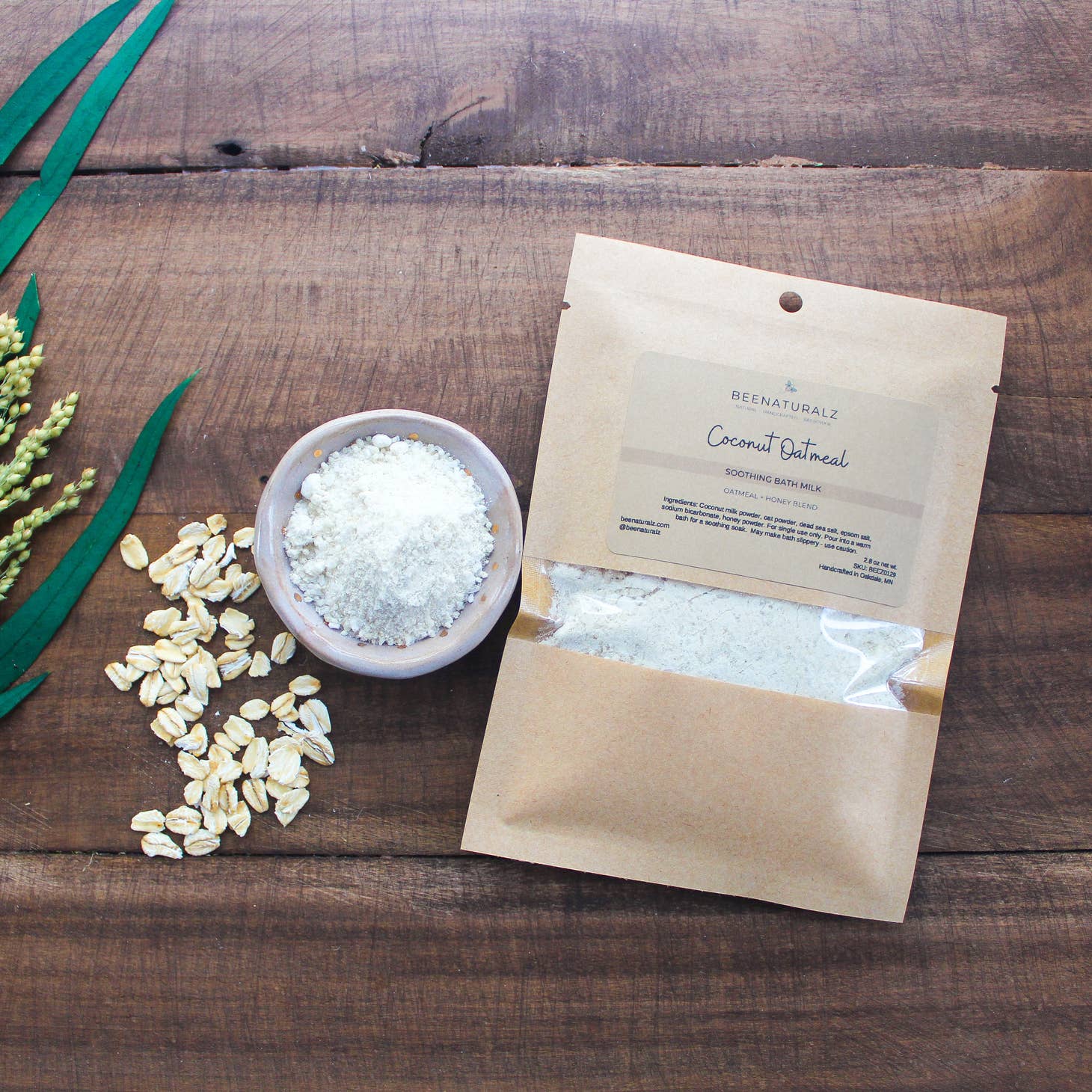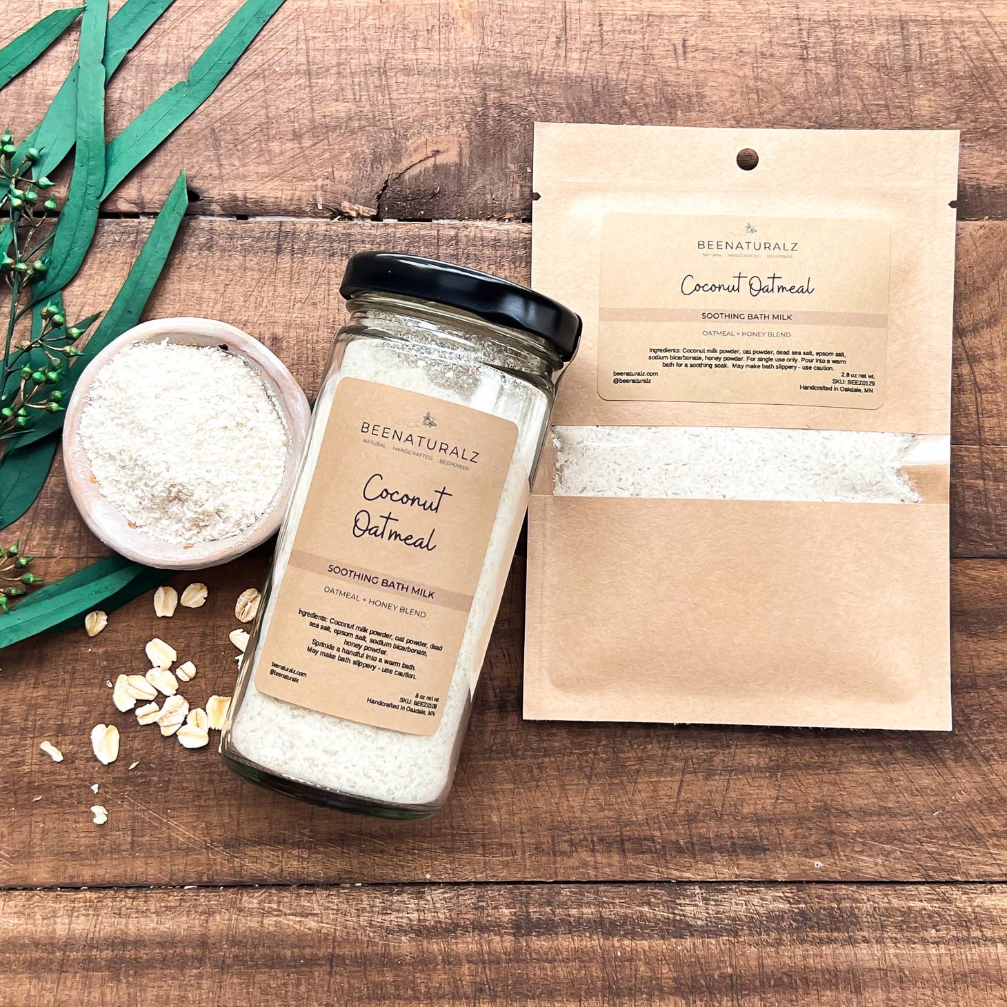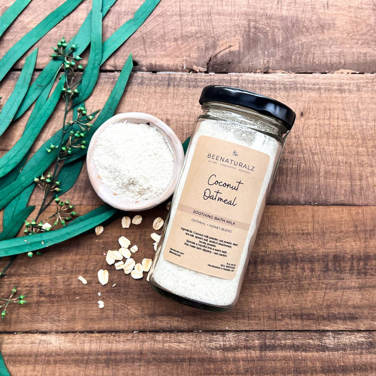 INGREDIENTS: dead sea salt, epsom salt, honey powder, sodium bicarbonate, coconut milk powder, oat powder