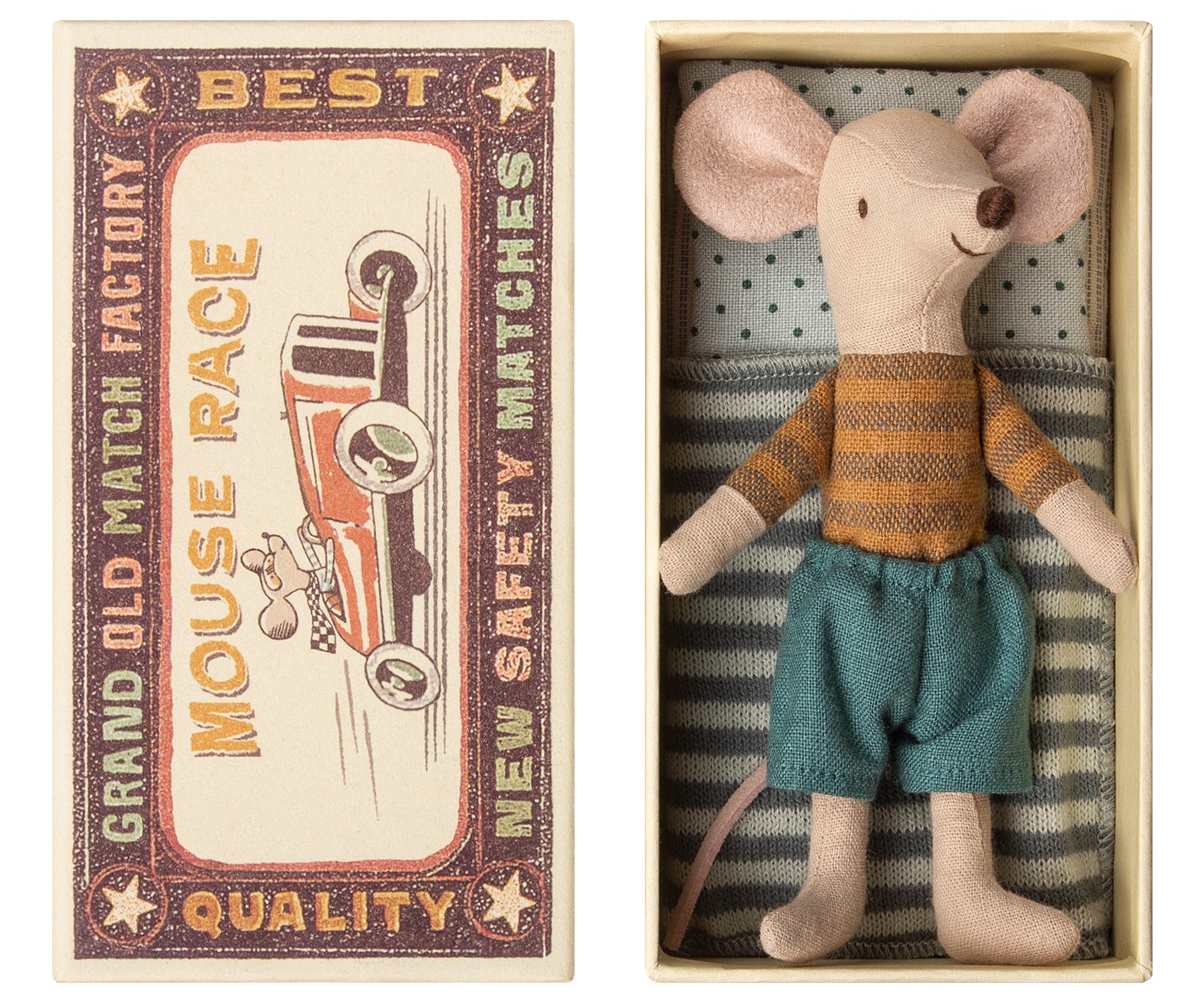 This Big Brother Mouse is ready for bedtime in his perfectly-sized matchbox bed or for fun adventures in his bright striped shirt and shorts.