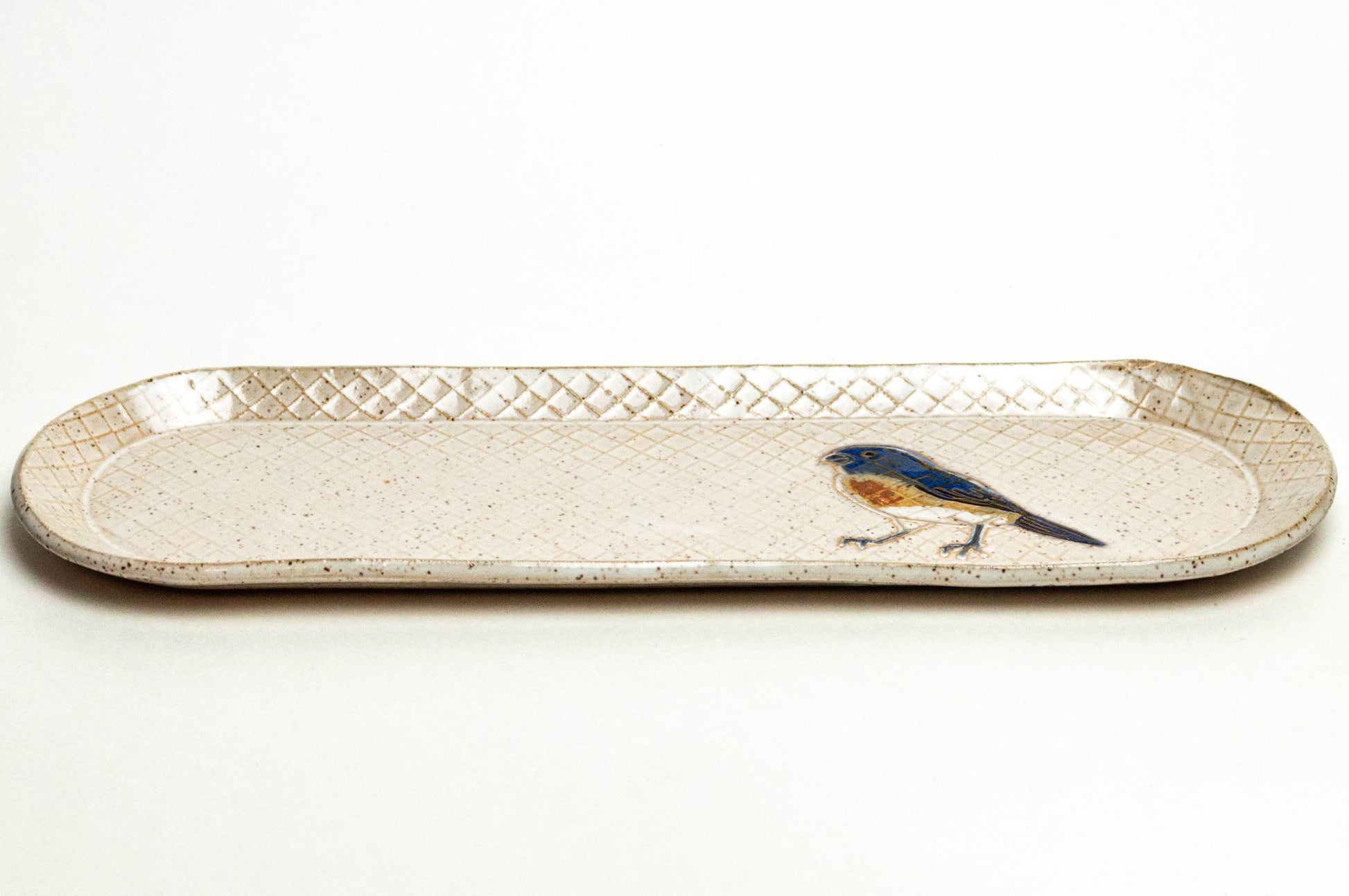 This beautiful stoneware ceramic oval tray features a sweet blue bird impressed into the clay and is hand-built and hand-glazed in Ohio. Measuring approximately 12 inches long by 4 inches wide, it's perfect for serving snacks, holding treasures, or simply brightening a shelf. Food, dishwasher, and microwave safe. Each tray is uniquely handmade—no two will ever be the same. Subtle color and glaze variations add to its one-of-a-kind charm.
