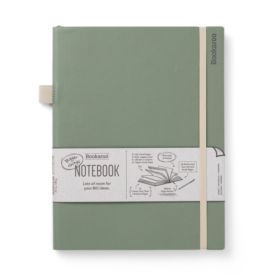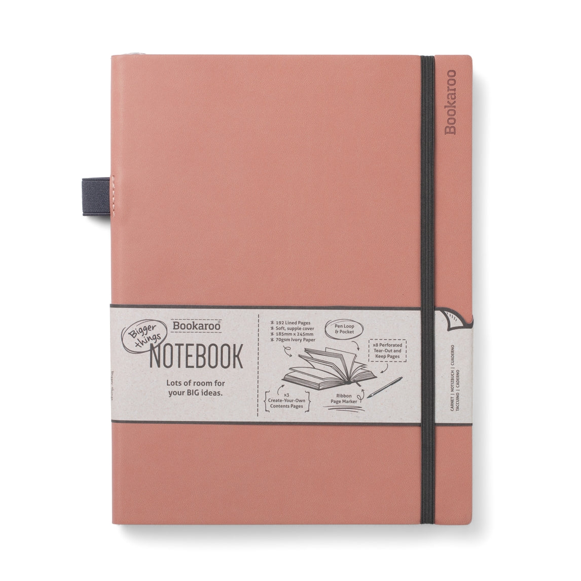 Bigger Things Notebook is a very pleasing size to hold, carry, and use, with lined pages for you to stick to (or completely ignore) and a super soft and bendy faux leather cover. It has all the usual useful Bookaroo notebook features but for this model, we have added a properly sized pocket in the back for those random bits of paper you need to keep safe and a pen loop in a very convenient place.