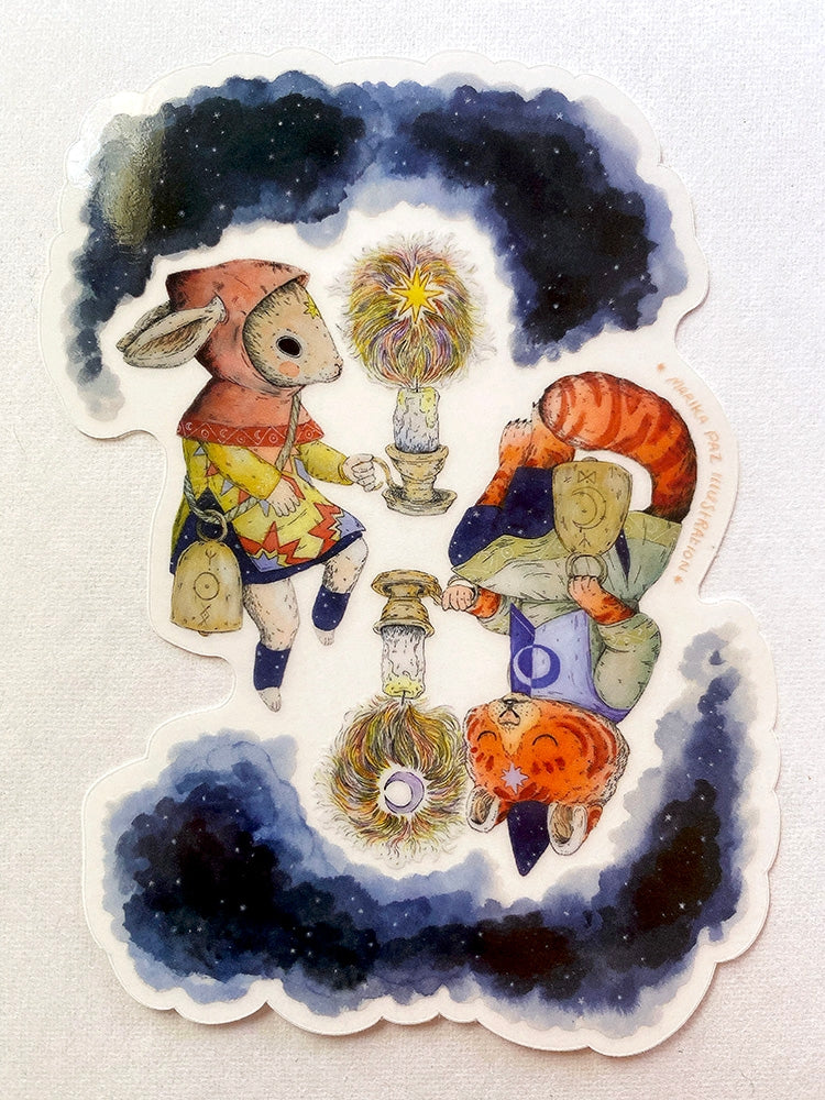 Two celestial beings pass each other in the stars. This vinyl sticker is transparent and is weather and waterproof-stick it on a notebook, bike, or car- it's going to stick around! Heck, throw it on a water bottle and through the dishwasher. This sticker can go anywhere. Sticker measures 4.5" x 3.5" Printed in USA.