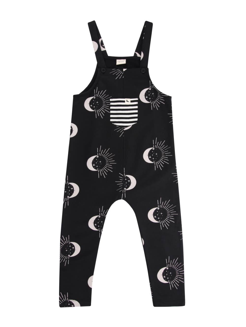 Our gender-neutral kids dungarees are a timeless essential for sustainable wardrobes. Made from 100% GOTS organic cotton jersey fabric, these contemporary classics will keep your kids comfortable all day long. Printed using azo-free dyestuffs these dungarees are sustainable, eco-friendly and kind to delicate skins too.The easy-fit style has adjustable strap button fastenings to maximise growing room and is ideal for easy dressing. Wear hems full-length or rolled up to suit any weather playdates. Find a front pocket for hidden treasures.