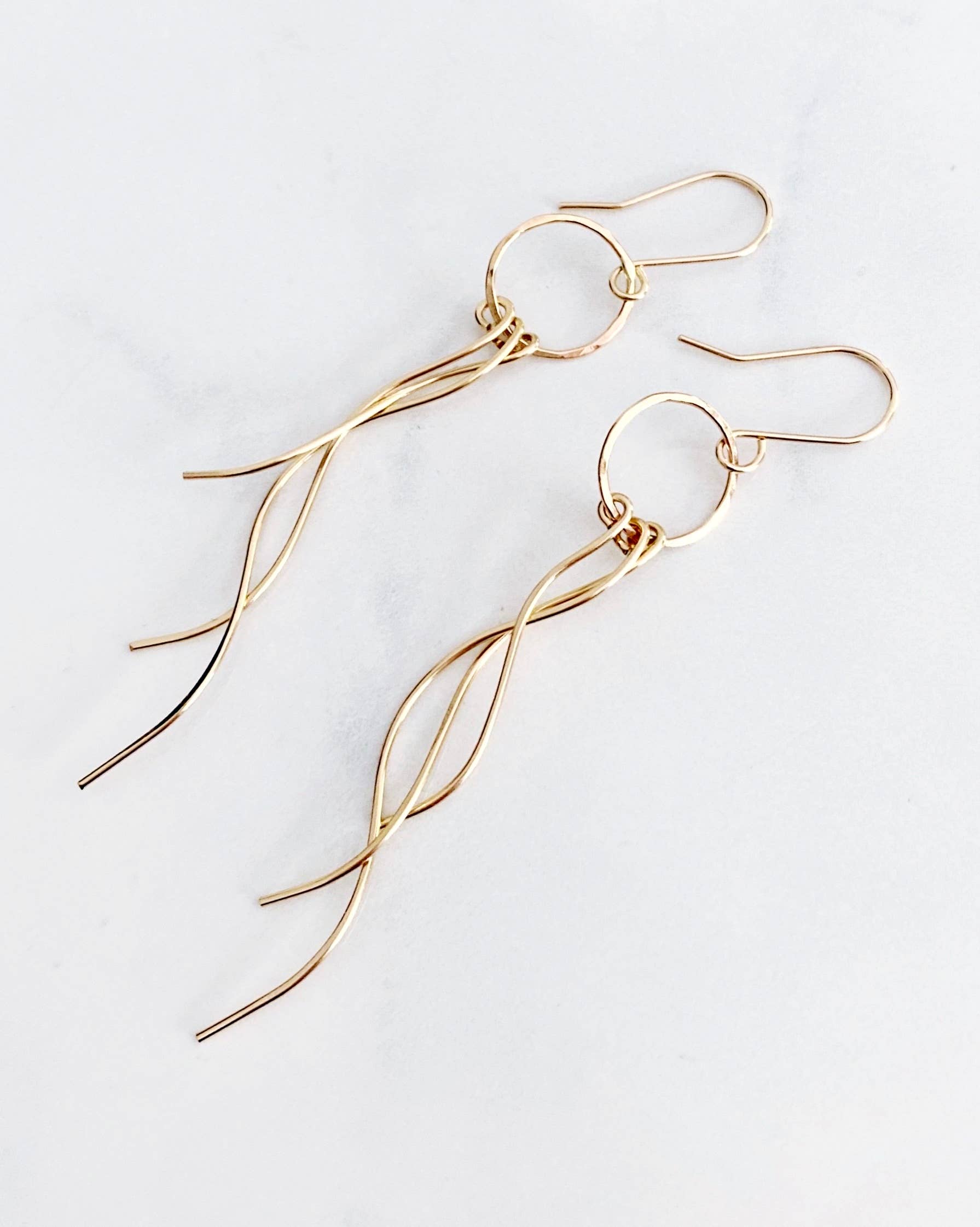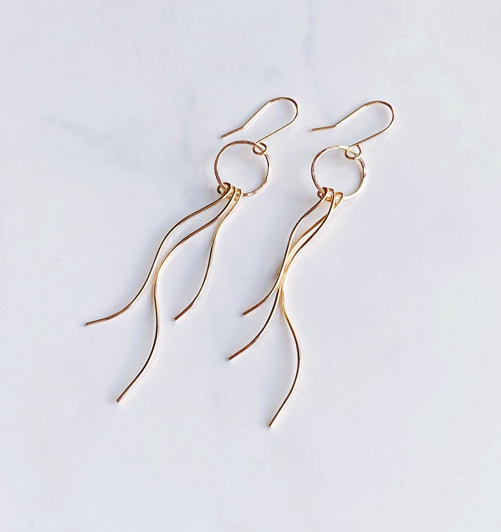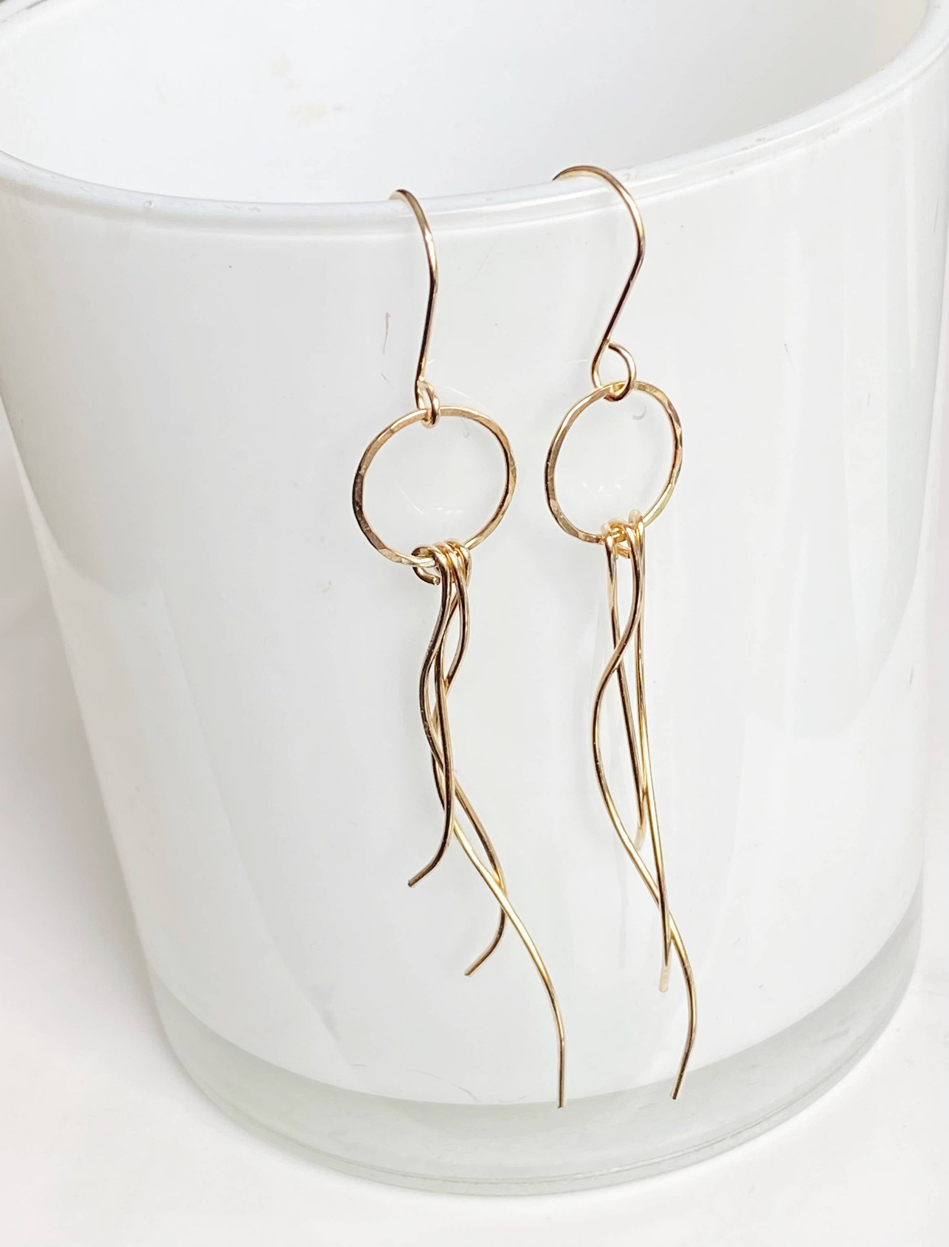 These stunning earrings are so unique and very flattering on the wearer. The circle at the top is hand-forged from 14kt gold-filled or sterling silver wire and hammered to create a dappled texture that catches the light. There are 3 wavy 14kt gold filled or sterling silver sticks that dangle from the circle. The french style ear wires are hand forged from 14kt goldfill or sterling silver They are lightweight and have great movement. They hang approx 2.5” from the bottom of the ear wire.