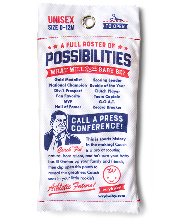 Each sports prediction is printed on a soft baby sports jersey. Then it’s bagged up tight to keep it as secret as a championship game playbook. Baby showers become ‘Opening Day’ when the bag is clipped, Coach’s prediction is revealed…and the crowd goes wild! Unisex, unique, and a total game changer!"