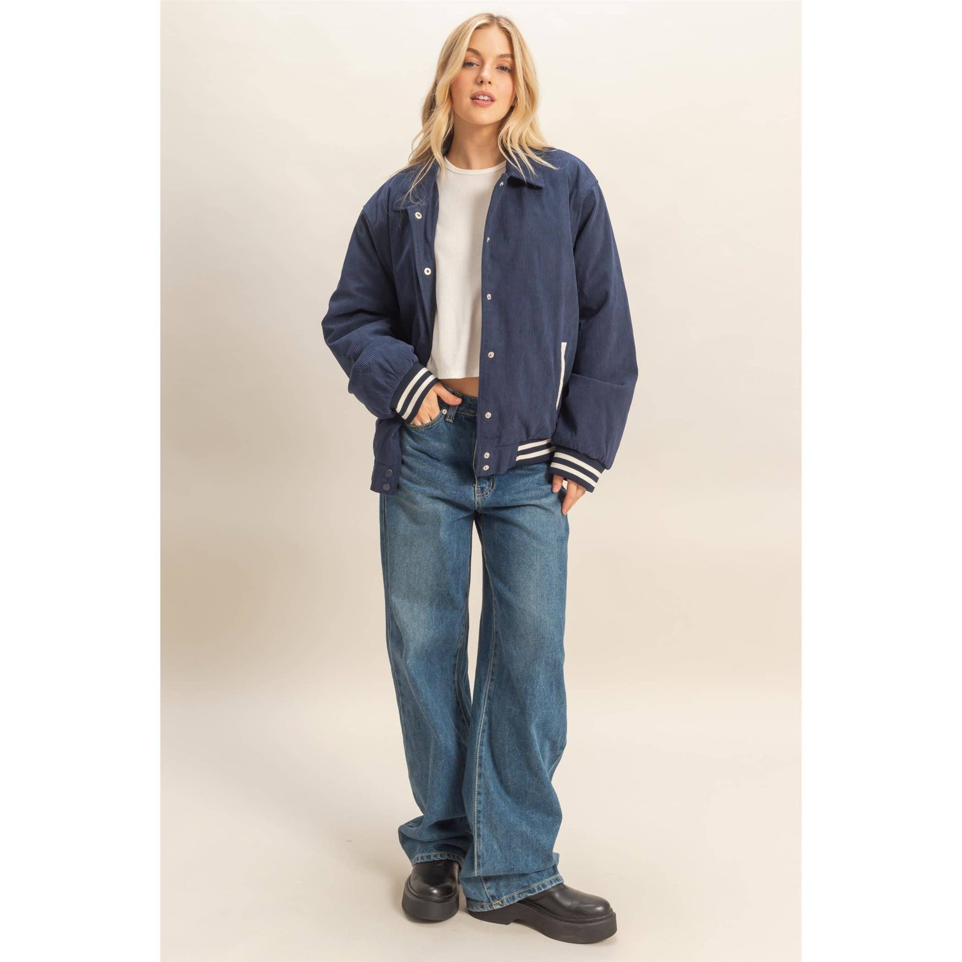 This varsity jacket, crafted in sumptuous corduroy, offers a fresh take on a classic style. Perfect for transitional weather, it is ideal for casual outings or adding a sporty touch to everyday ensembles. Layer it over a light sweater or a crisp t-shirt for effortless style and comfort.