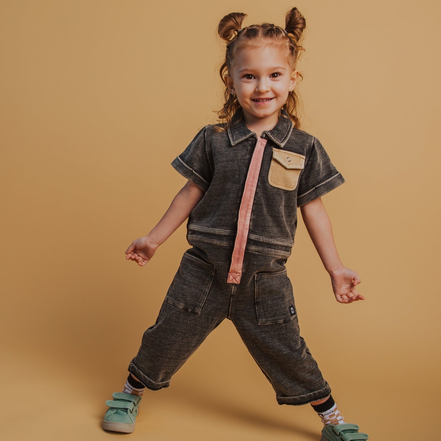 Introducing the cutest coverall in 'Black Washed Denim!' Our thoughtful design includes a playful contrast pocket and zipper, as well as convenient hip pockets.
