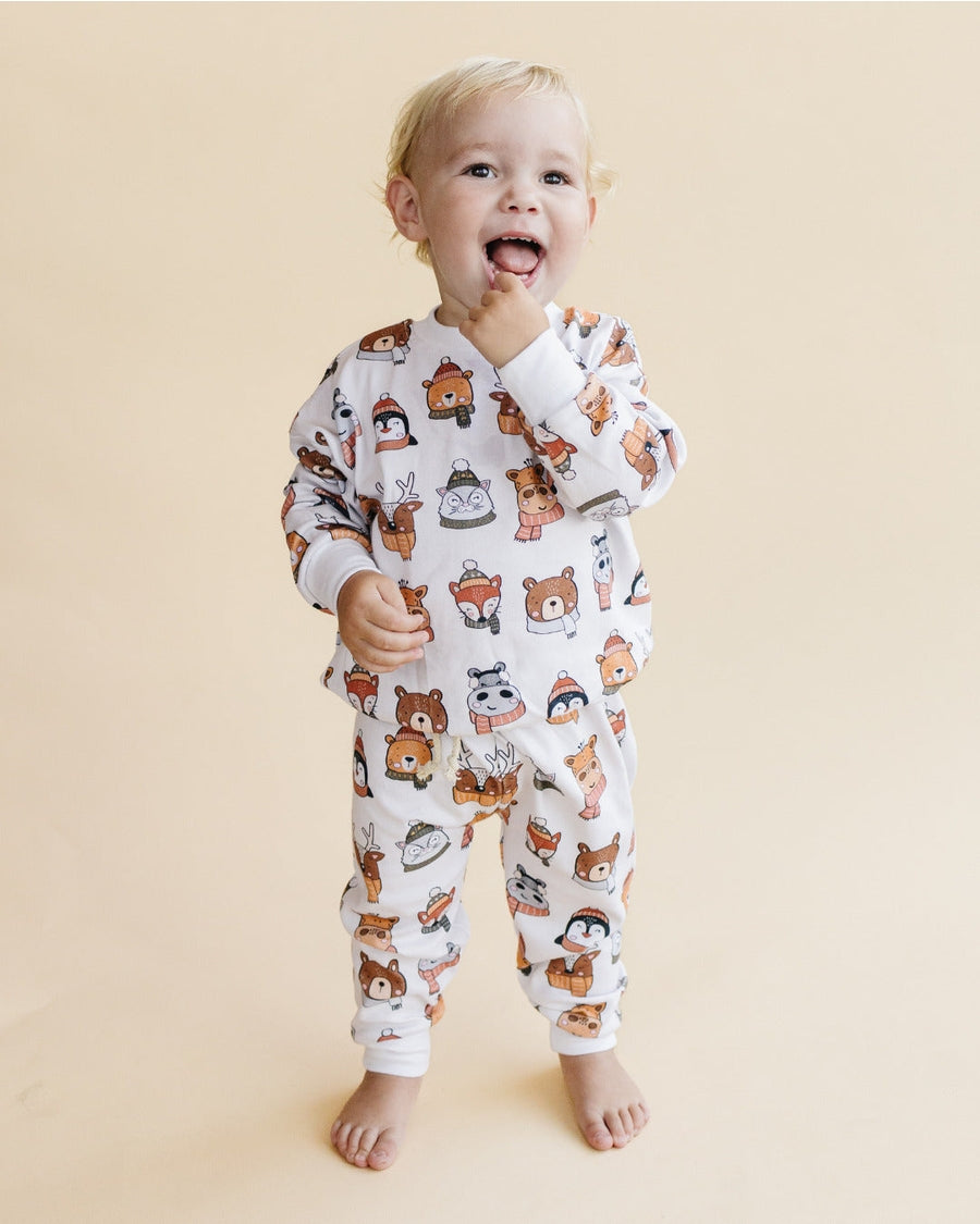 Meet with your winter besties: Cozy Pals! This two-piece set is made of oh-so-soft cotton, perfect for daily lounging during the upcoming winter months! Stylish enough for a day out, cozy and comfortable for play. Gender neutral, this sweet and cute design will be your little one's favorite must-have! Made by Lucky Panda Kids