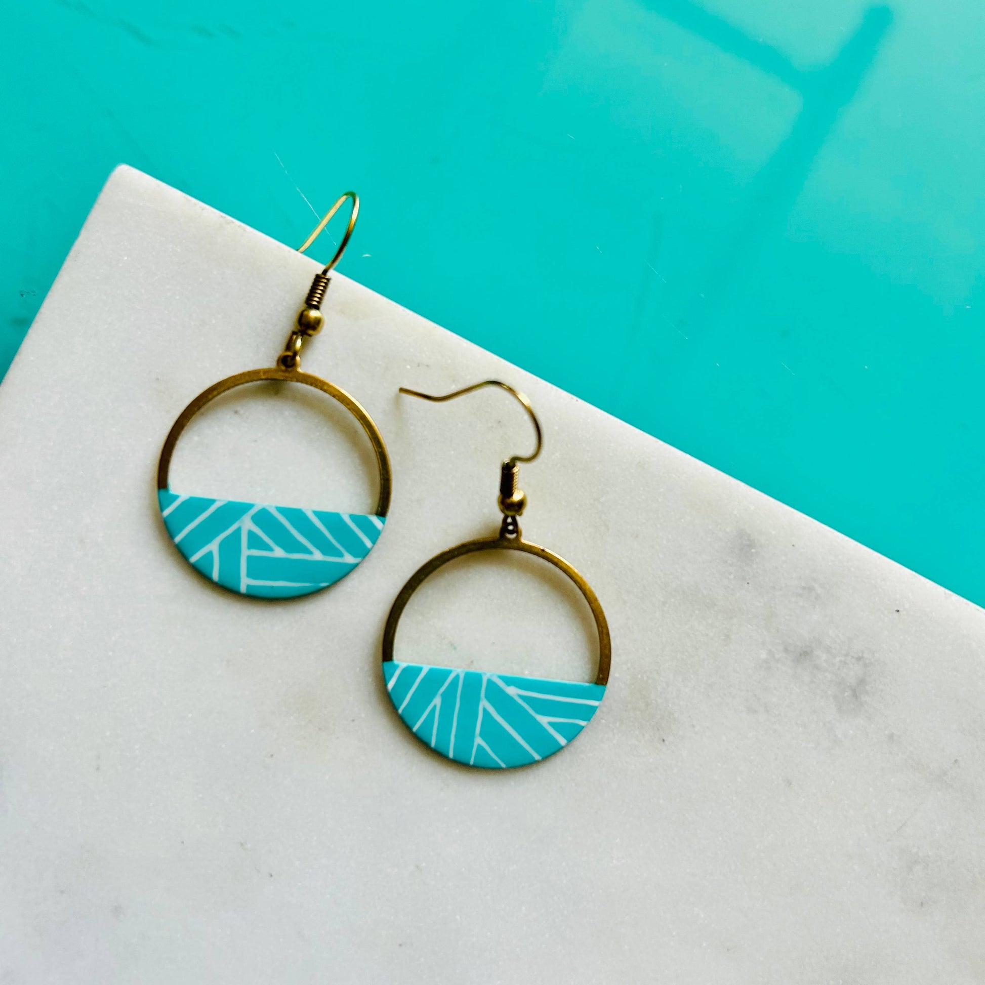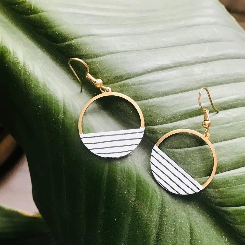 These brass crescent hoop earrings have been given an upgrade with hand painted acrylic details & linework.
