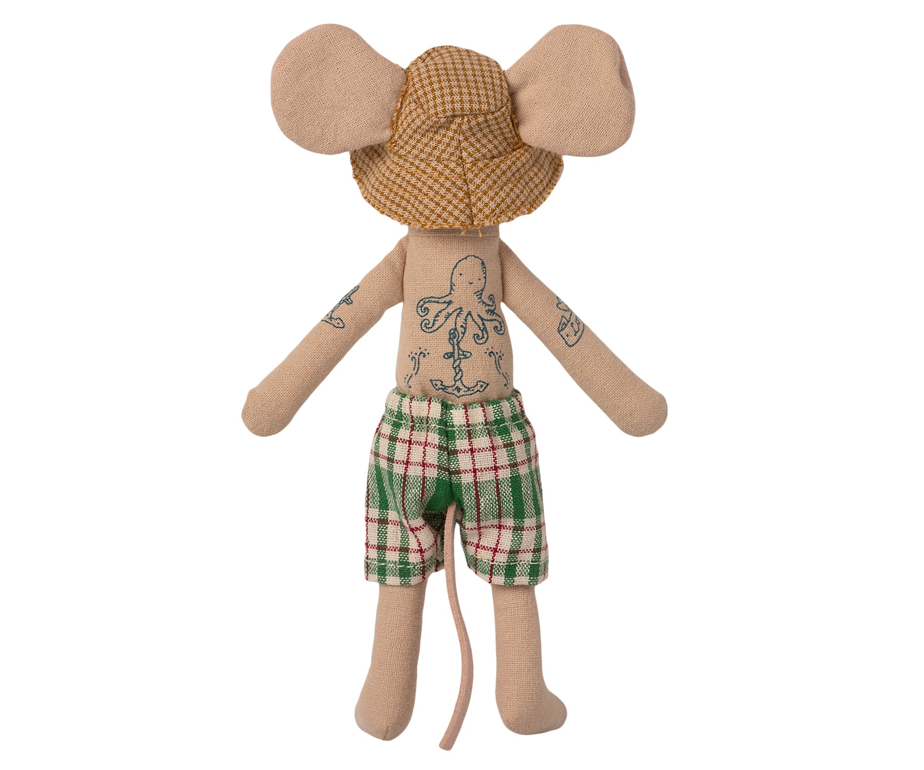 Vacation time. This mouse is ready for a day at the beach with his family. Beach dad's tiny tattoos, swim trunks, and hat complete his summer look.