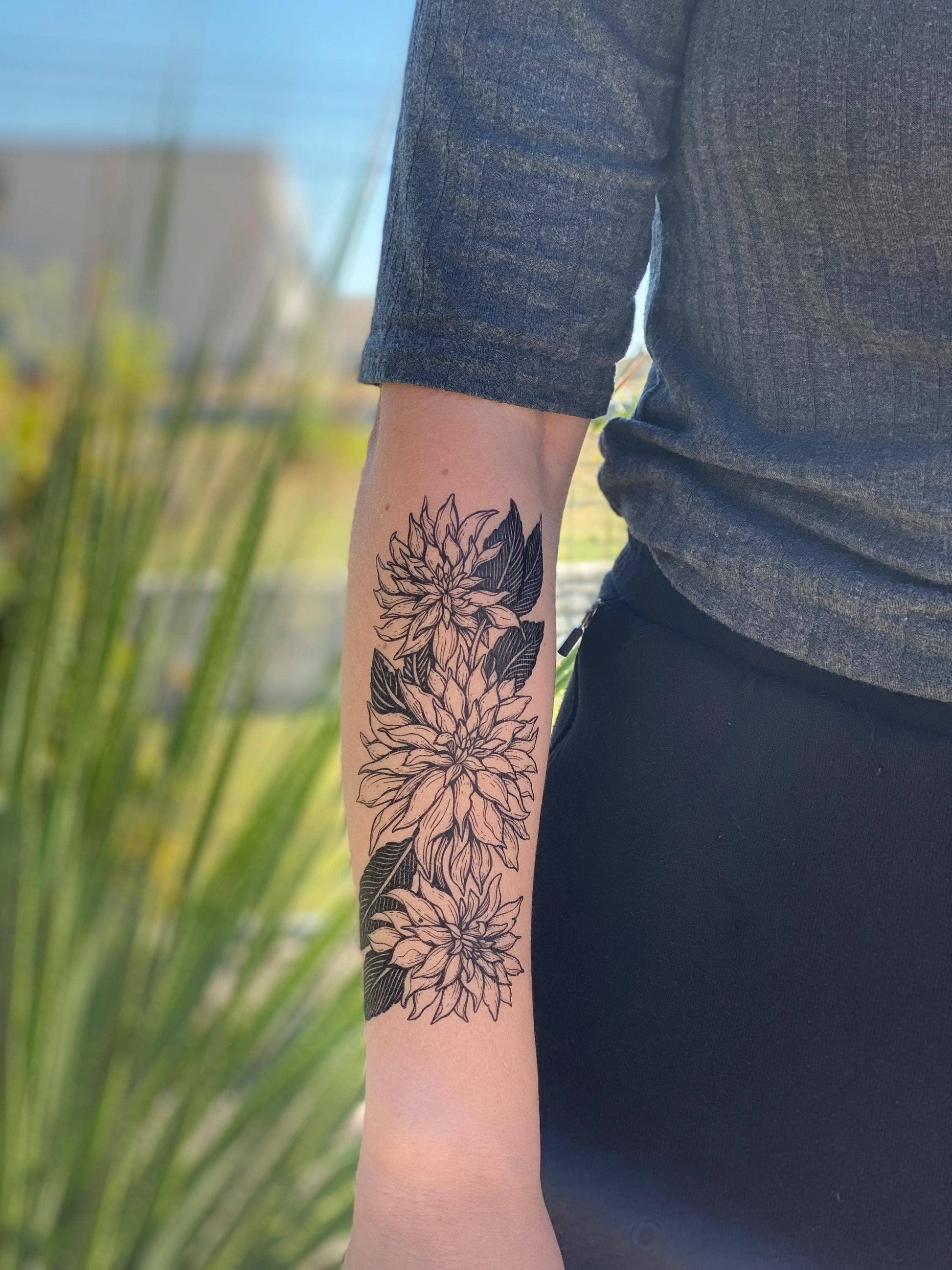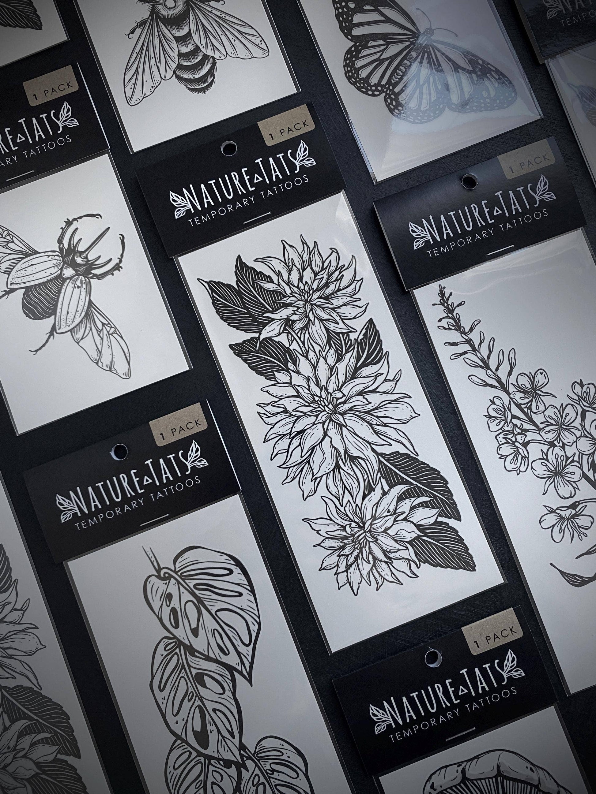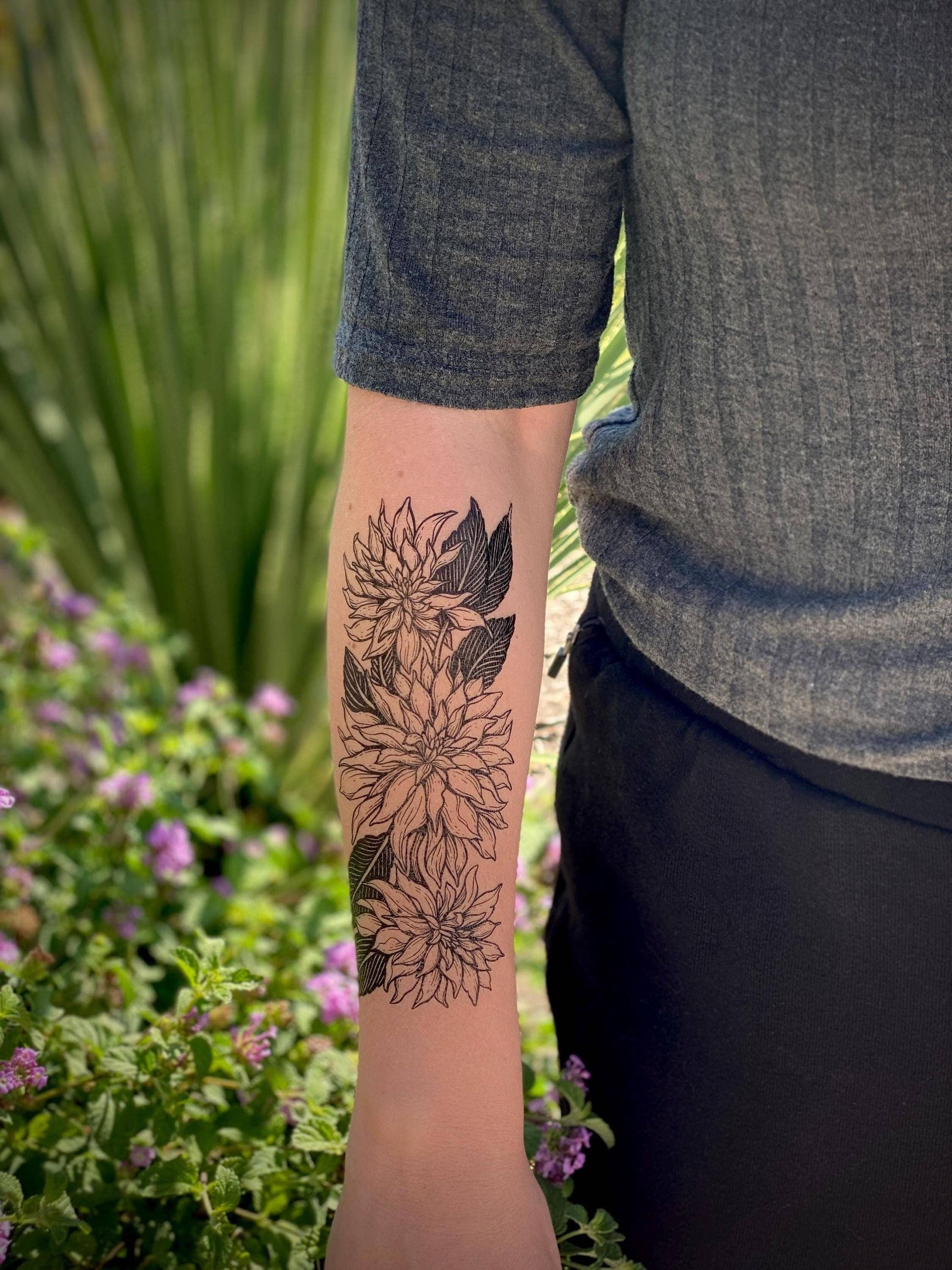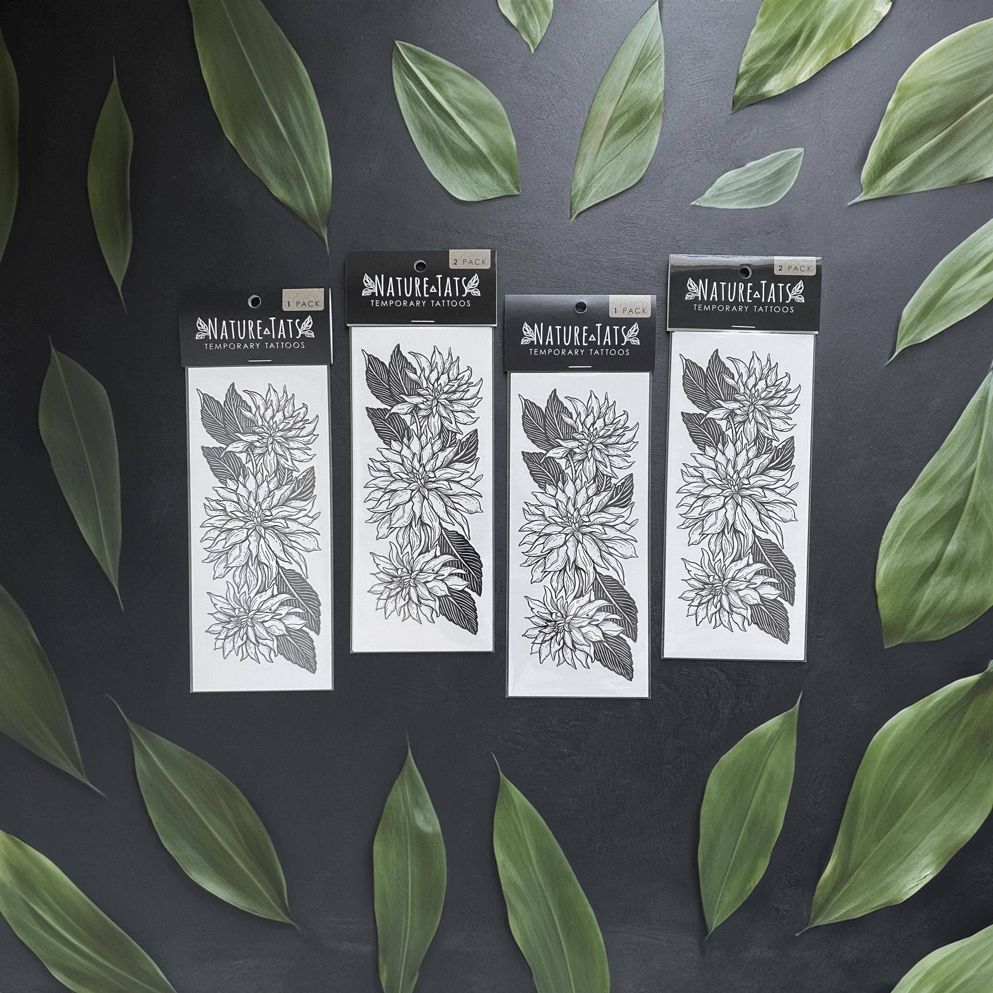 Dahlia flower temporary tattoo, this black line design features a triple dahlia flower arrangement with dark contrasting leaves. Long ago, the Mexica (or Aztec) people had a profound reverence for the natural world - especially the flora. They cherished flowers, including one they called "Cocoxochitl," or "water pipe flower." Today, we know them as dahlias! The Mexica used them for a variety of purposes, including food, medicine, and plumbing! When the dahlia made its way to Europe in the 18th century it was a fast flowerbed favorite, and today there are 57,000 known cultivars in every size, shape, and color imaginable! The dahlia flower radiates an aura of mystical beauty from a time long ago, and symbolizes elegance, dignity, and abundance.