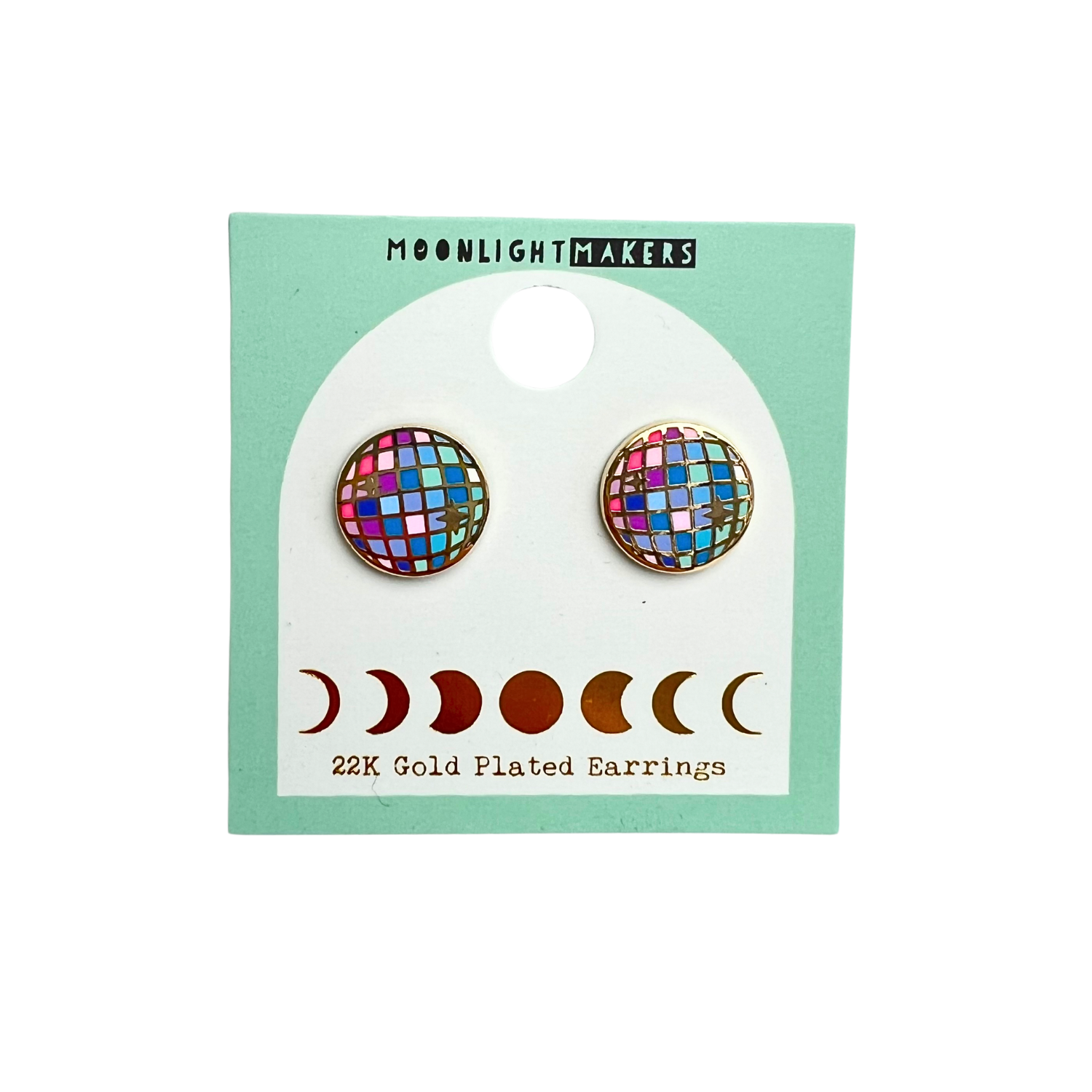 Dance into fun with our Colorful Disco Ball Earrings. These playful studs feature a pair of vibrant disco balls, crafted from hard enamel with 22k gold plating and hypoallergenic stainless steel posts.