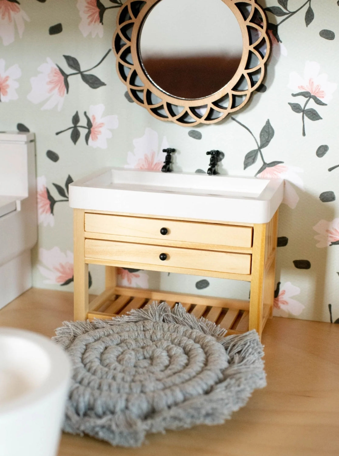 Double black, wood faucets, 2 functioning drawers, and room below for all your miniature necessities are ready for the next level of dollhouse designs.