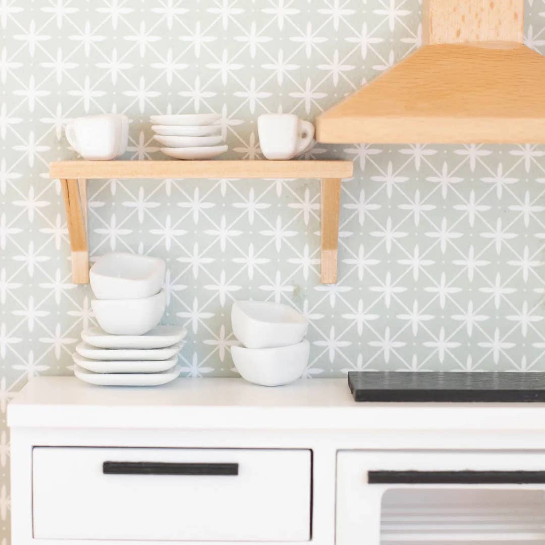 A classic dishes set for your miniature world. Serve countless pretend tiny meals on these dishes. They're adorable for displaying on open shelving in your miniature kitchen!