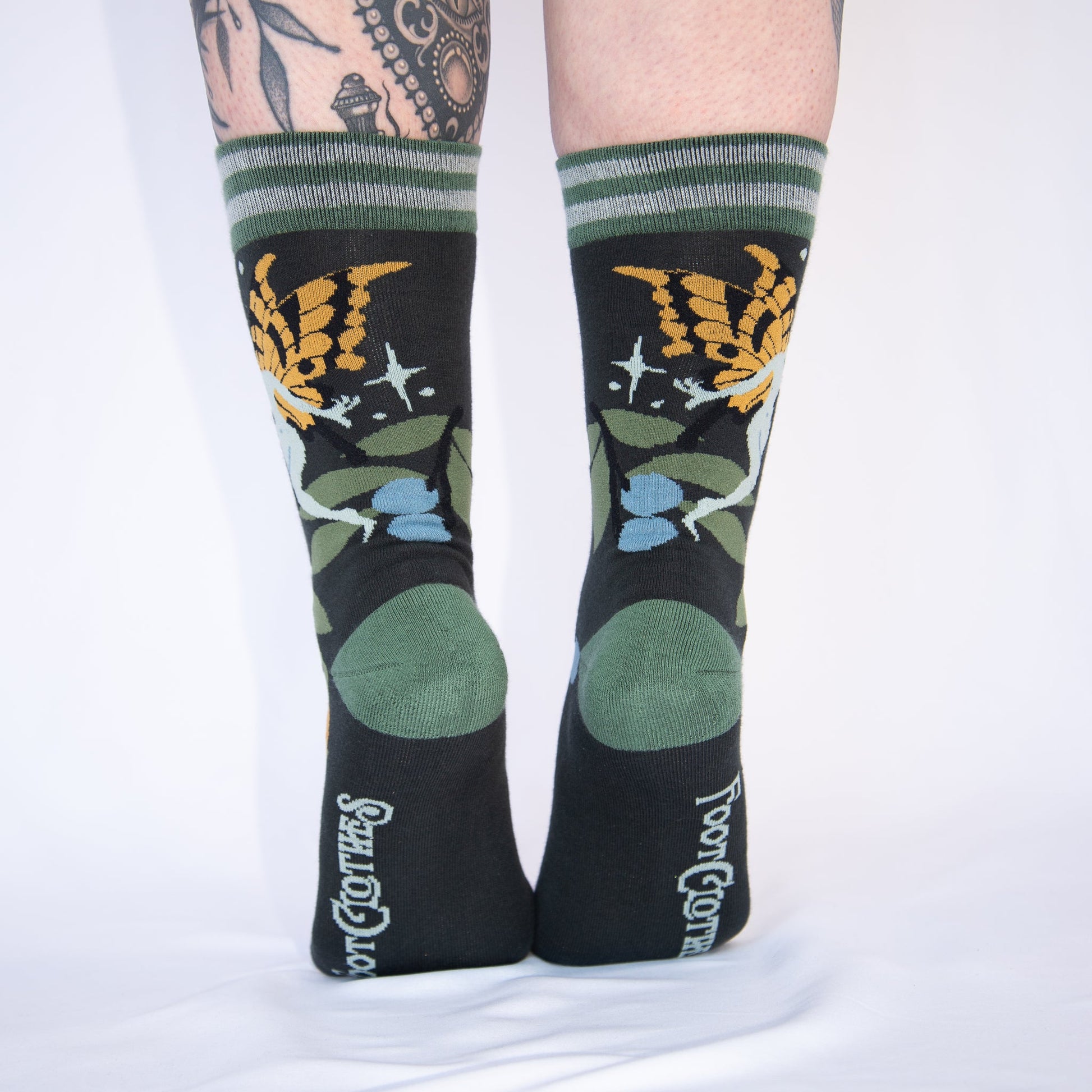 Sprinkle a touch of fantasy into your outfit with this celebration of the mythical realm of the fairies. Delicate wings and vibrant colors take flight across your feet taking your imagination right along with them.