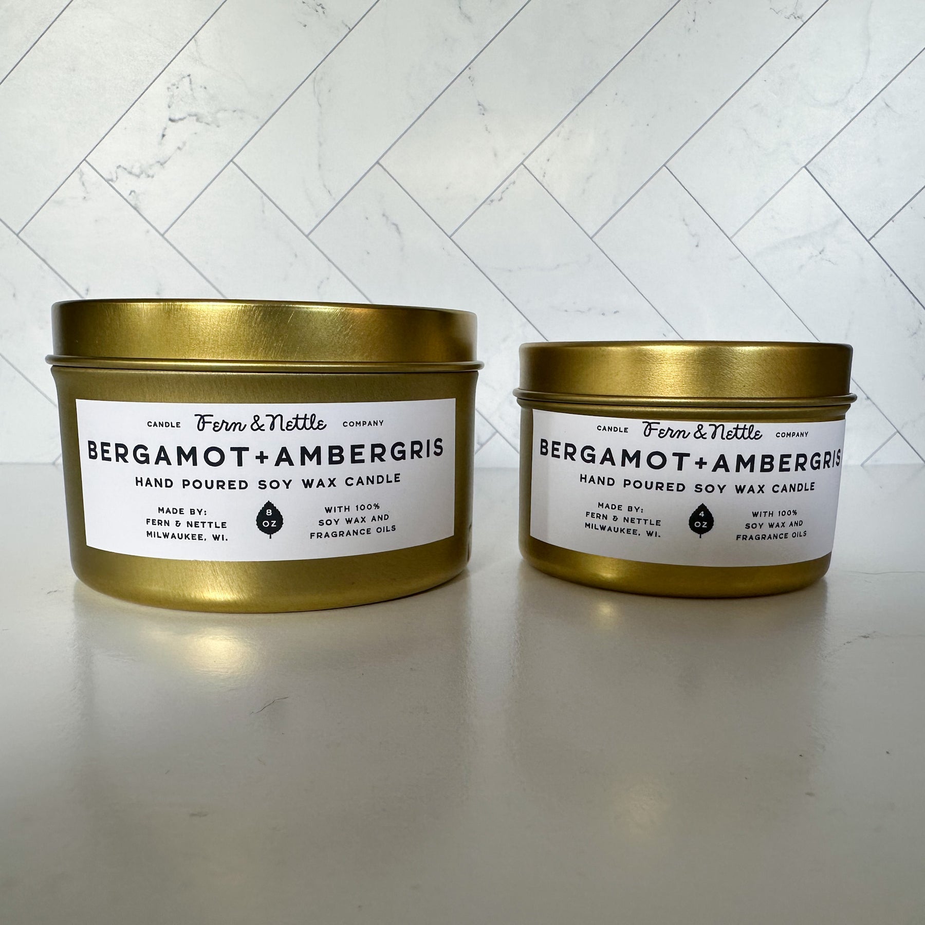 Hand poured soy wax candle with fragrance and essential oils, in a 4 or 8 ounce golden tin or an 8 ounce glass jar with lid.