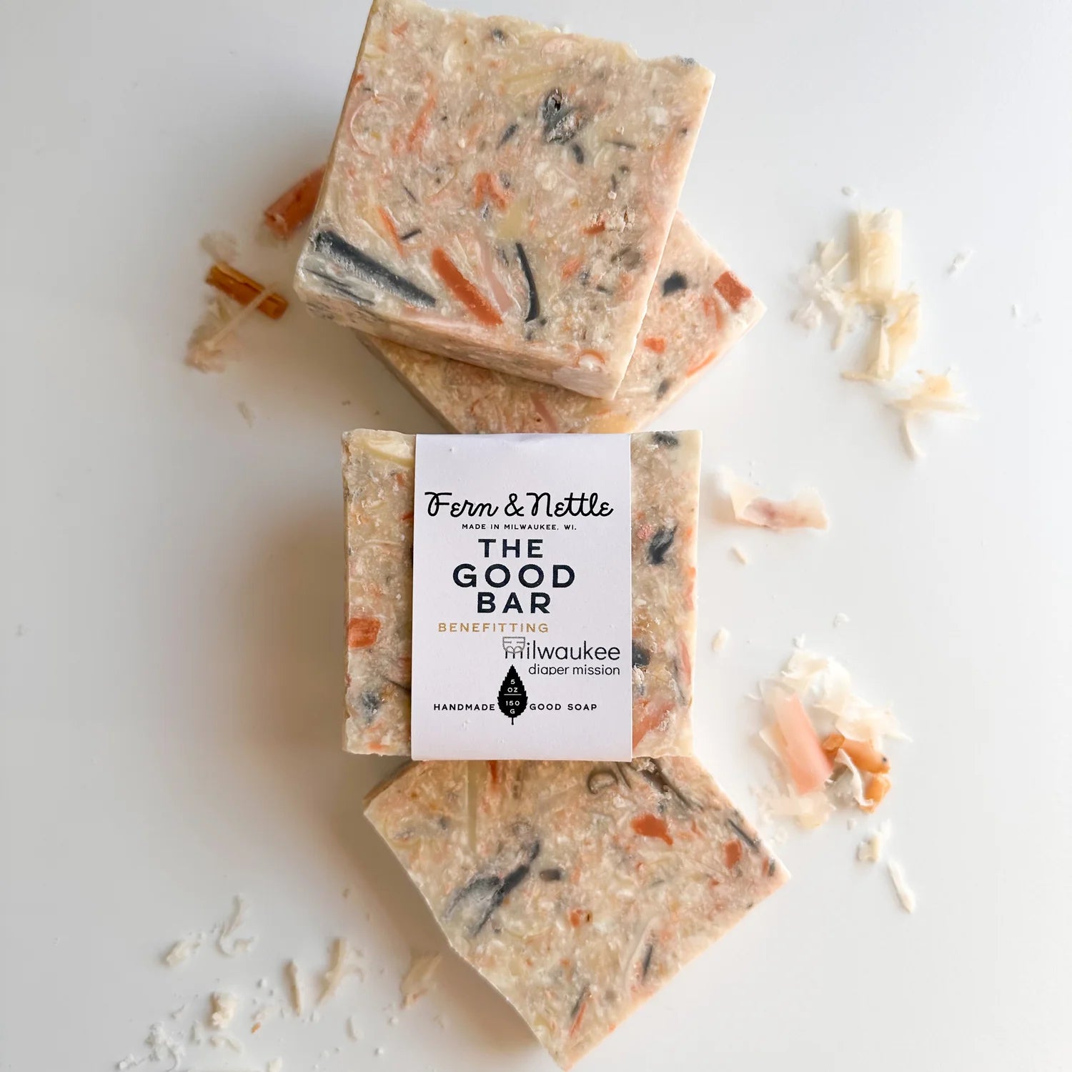 This soap has a little bit of all the soaps we make— good little bits coming together for a Good Bar. $1 of each bar will go directly to Milwaukee Diaper Mission, a nonprofit organization that empowers families in need by providing a reliable source of free diapers and period supplies.