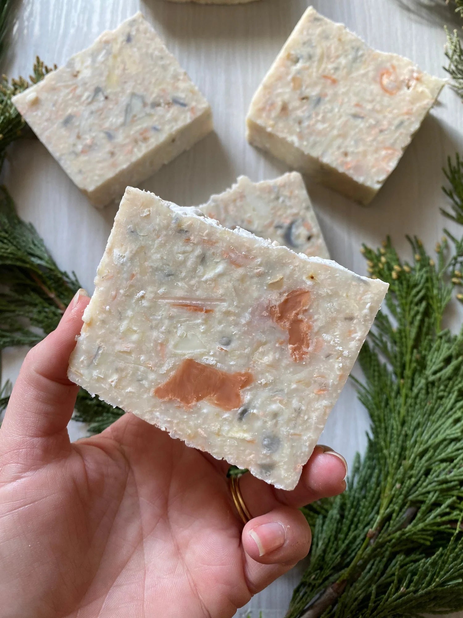 Please note— this bar contains bits of all the soaps— including French green clay, rose kaolin clay, kaolin clay, charcoal, Moroccan red clay, goat milk, herbs, essential oils, beer, oatmeal, and maybe, just maybe, a stray cat hair— if you’re lucky.