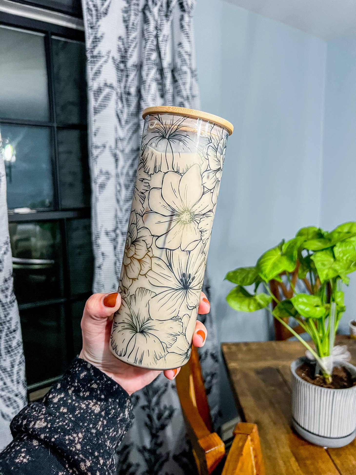 25oz glass tumbler comes with a sealed straw and bamboo lid.