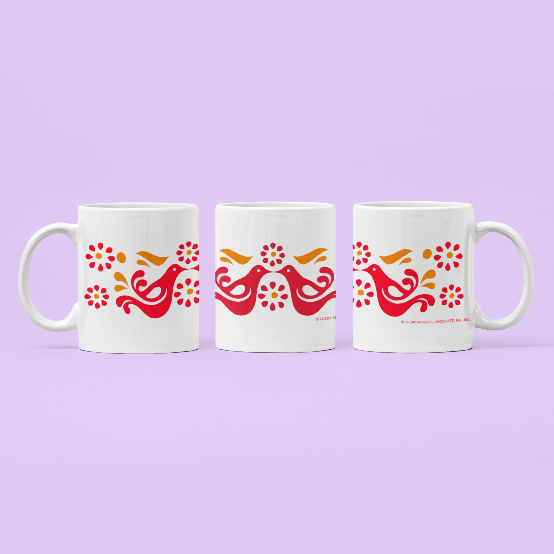 Mugs are made of glossy ceramic and hold up to 11 ounces of liquid. These mugs are dishwasher safe and microwave safe. They are printed individually with a sublimation press. Each mug includes a Lucky Manufacturing seal sticker on the bottom and is wrapped in bubble wrap and tissue paper. Each mug is proudly designed and printed in Lancaster, PA!