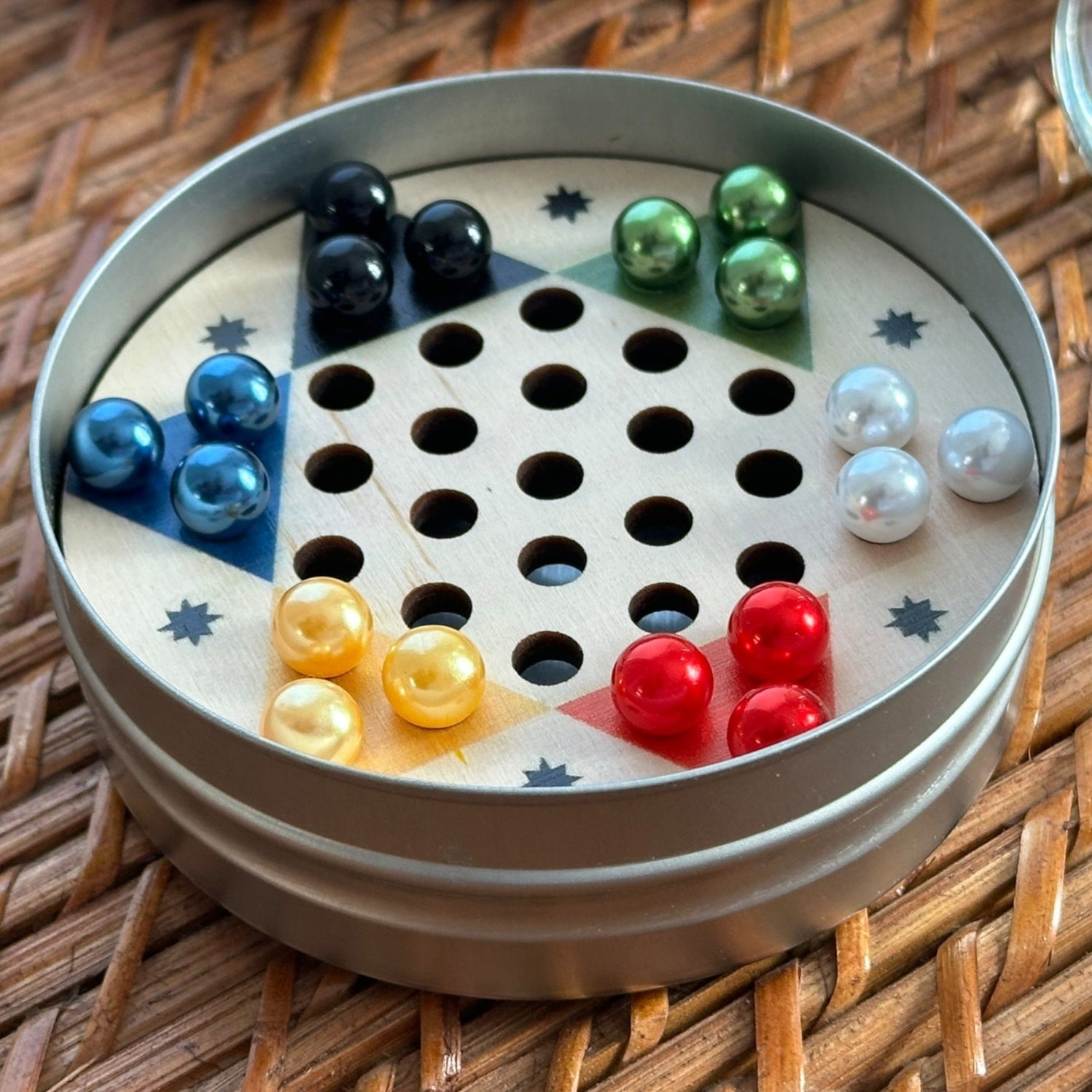 This classic board game is actually German in origin. Our version is scaled down for travel with each player having three pieces for faster-paced games.
