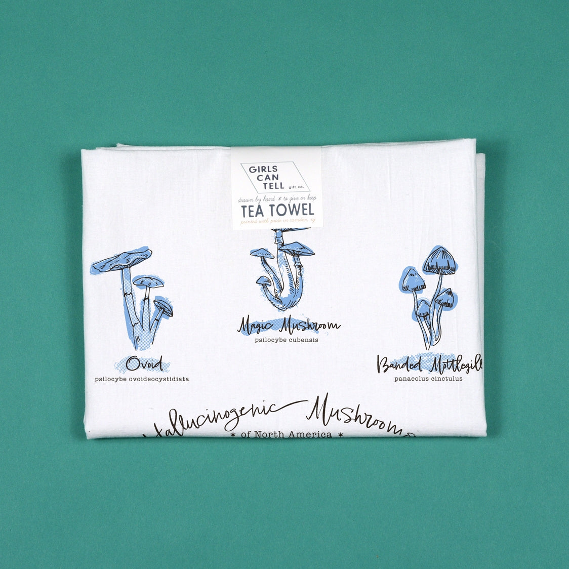 Part of our mushroom collection, this tea towel showcases some of the hallucinogenic mushrooms you might come across walking among the forests and woodlands of North America. Do not collect, though! Possession of these mushrooms is illegal, so best to settle for a picture of them on a cute tea towel.