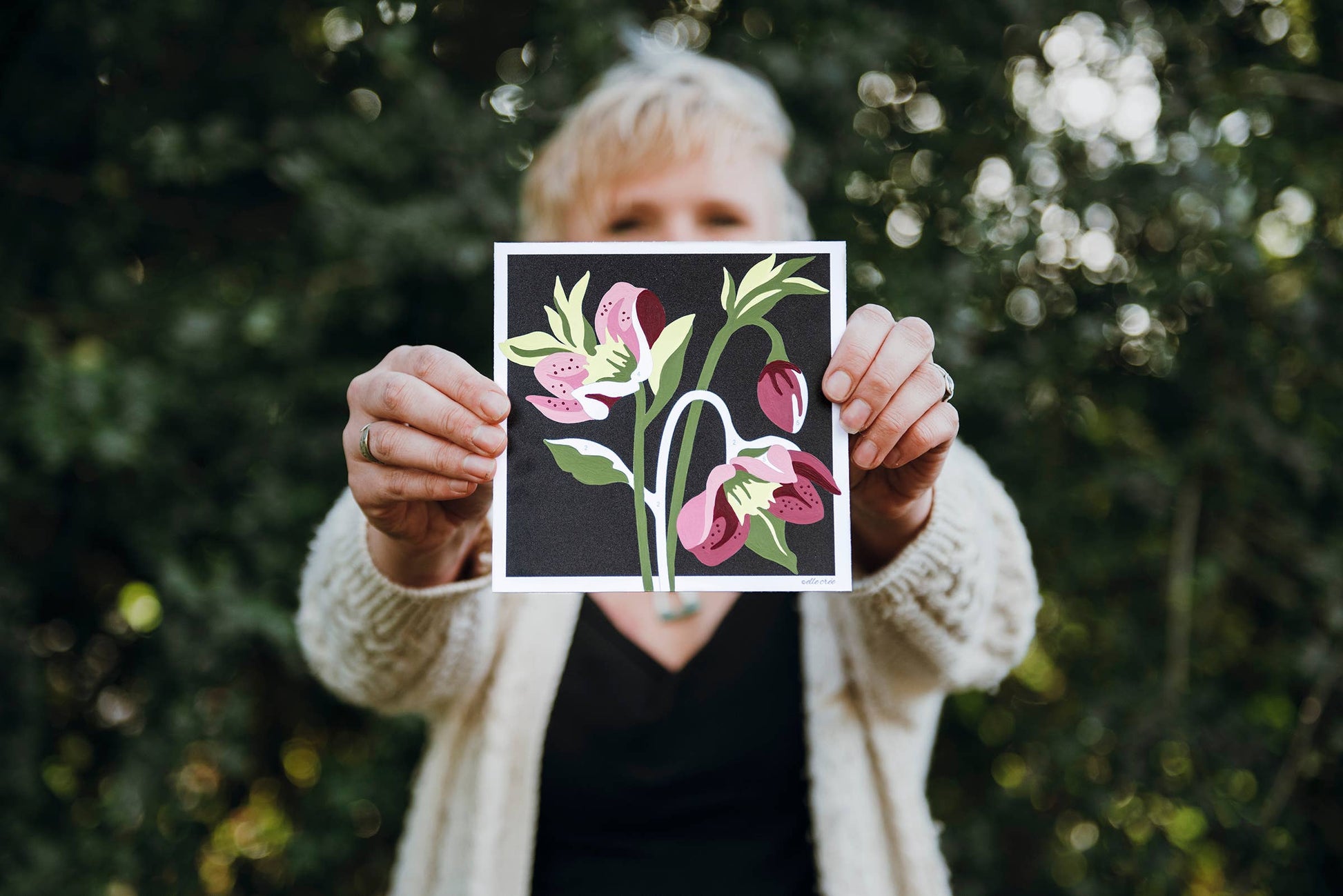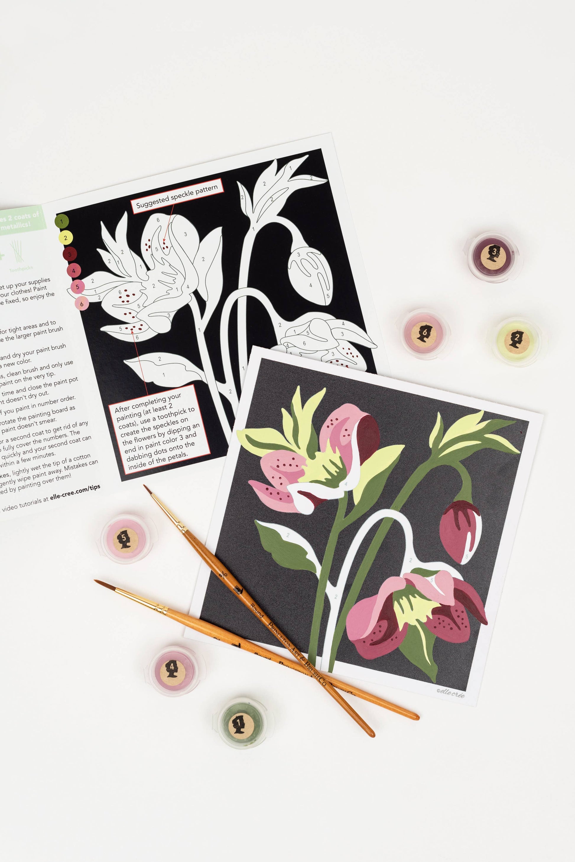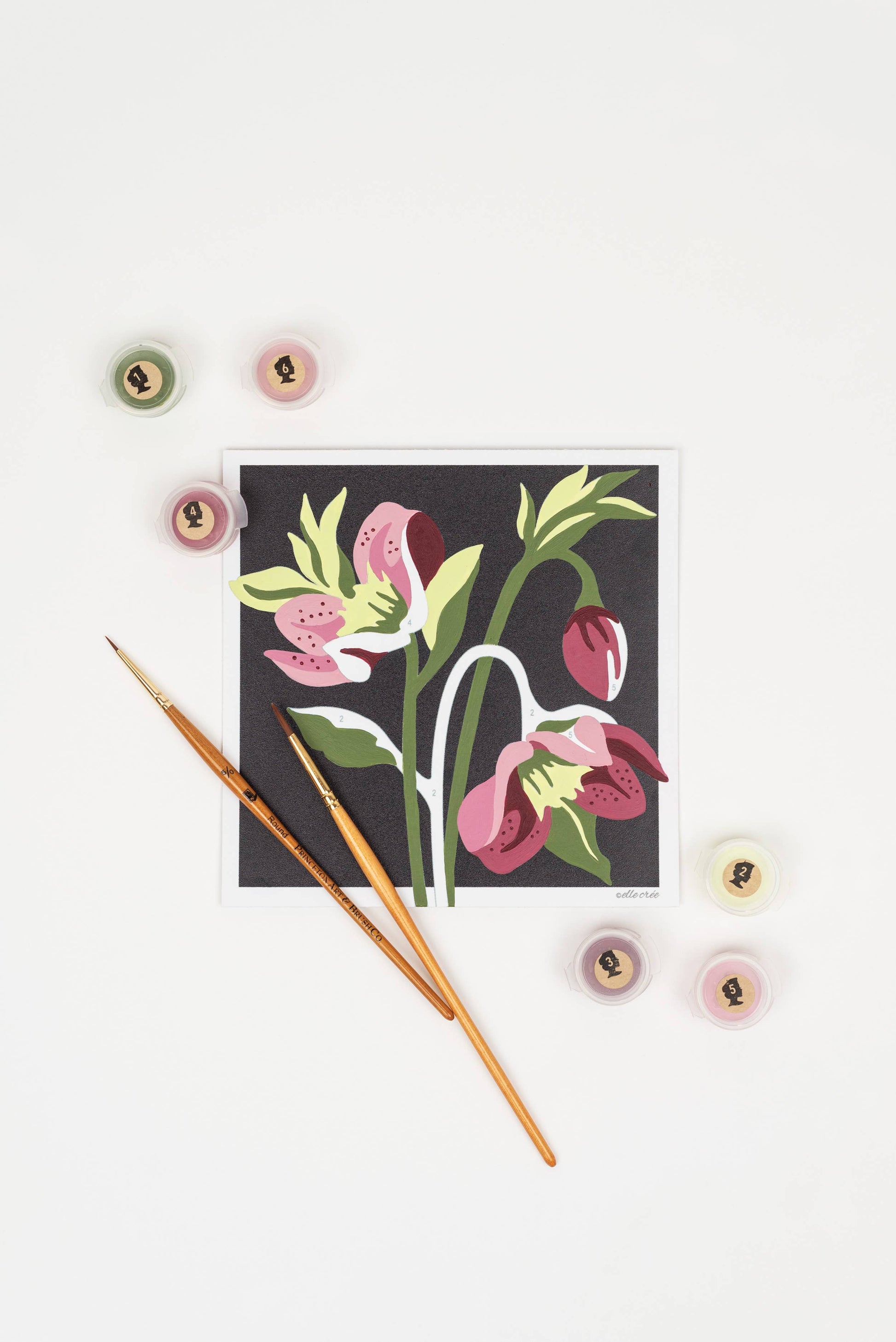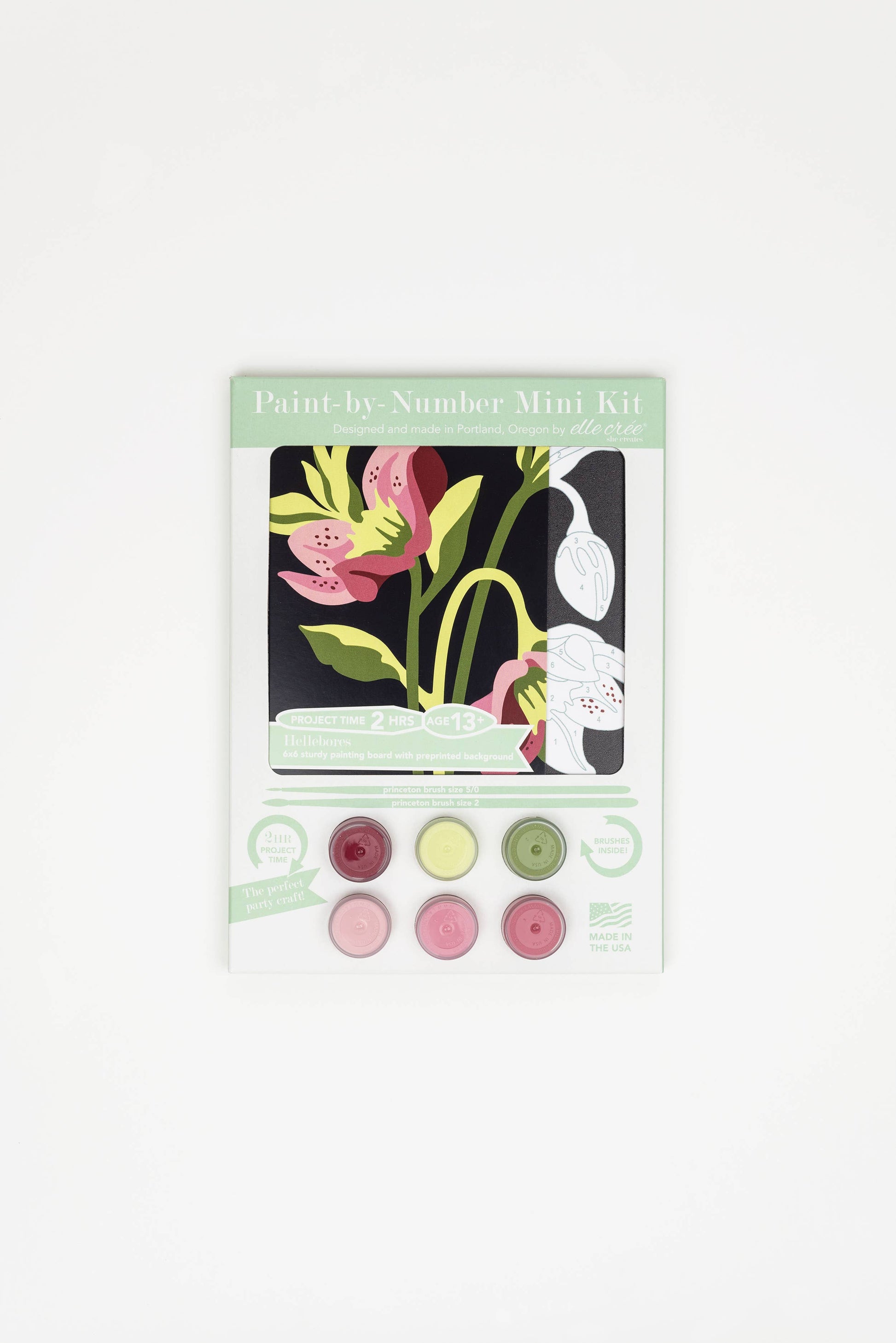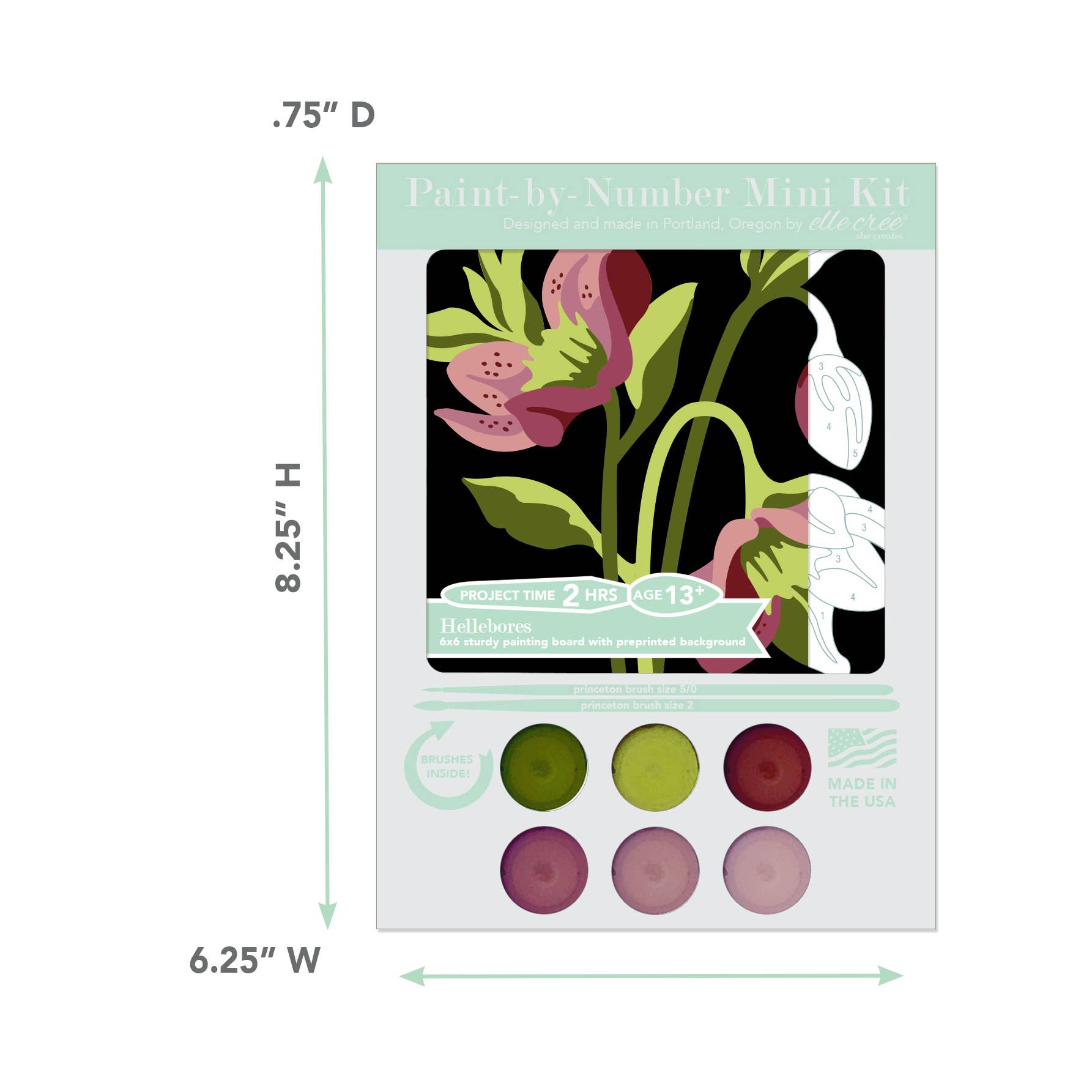 The perfect party activity! “Hellebores” mini paint-by-number kit (6"x6" painting board) depicts a cluster of orchid-colored Lenten Rose blossoms. The preprinted background sets these stems against a striking black with white border.