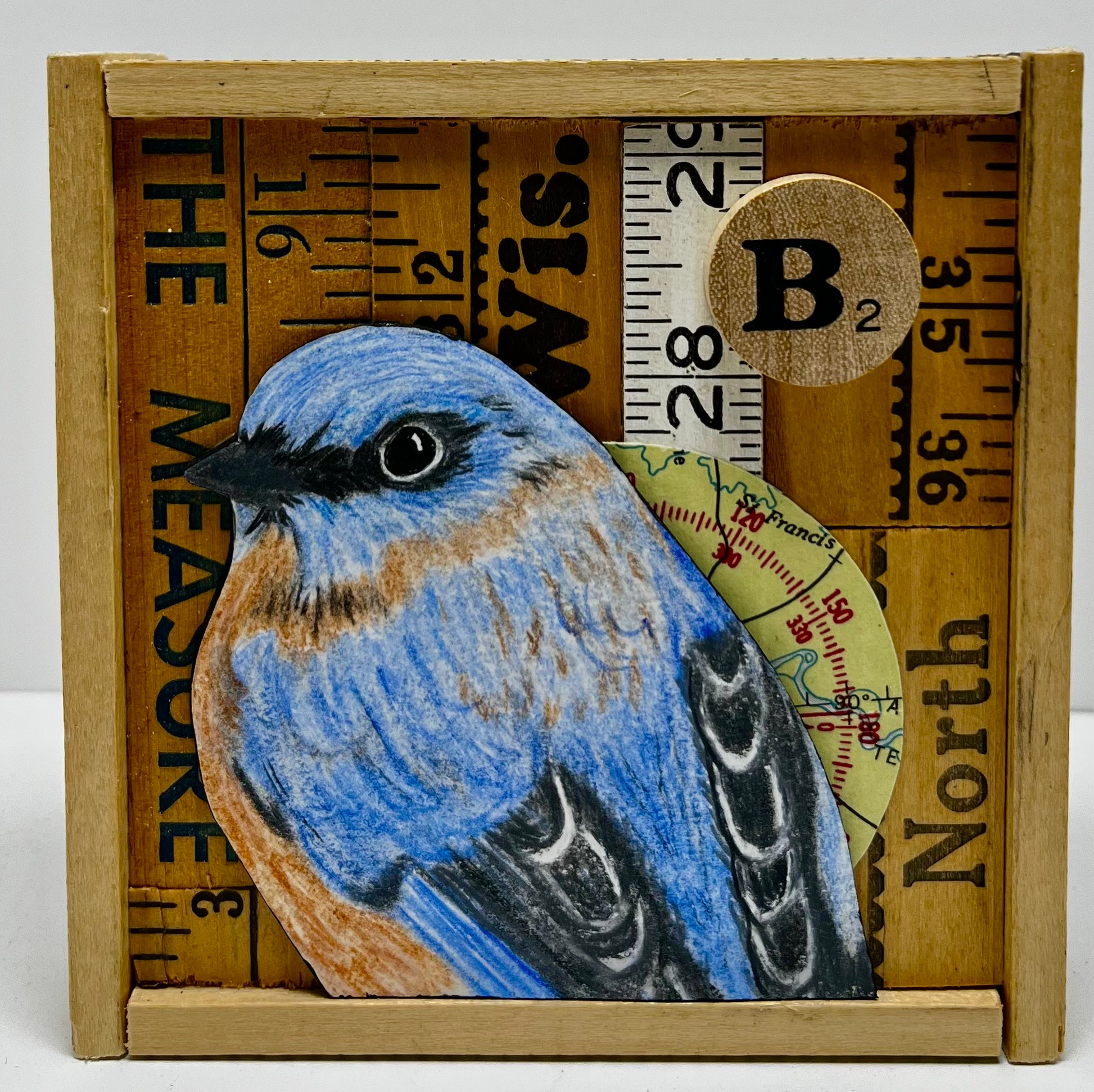 Colored pencil drawing mounted on balsa wood, yardsticks and vintage ephemera. Made in Milwaukee, WI by local artist Pam Mehnert.