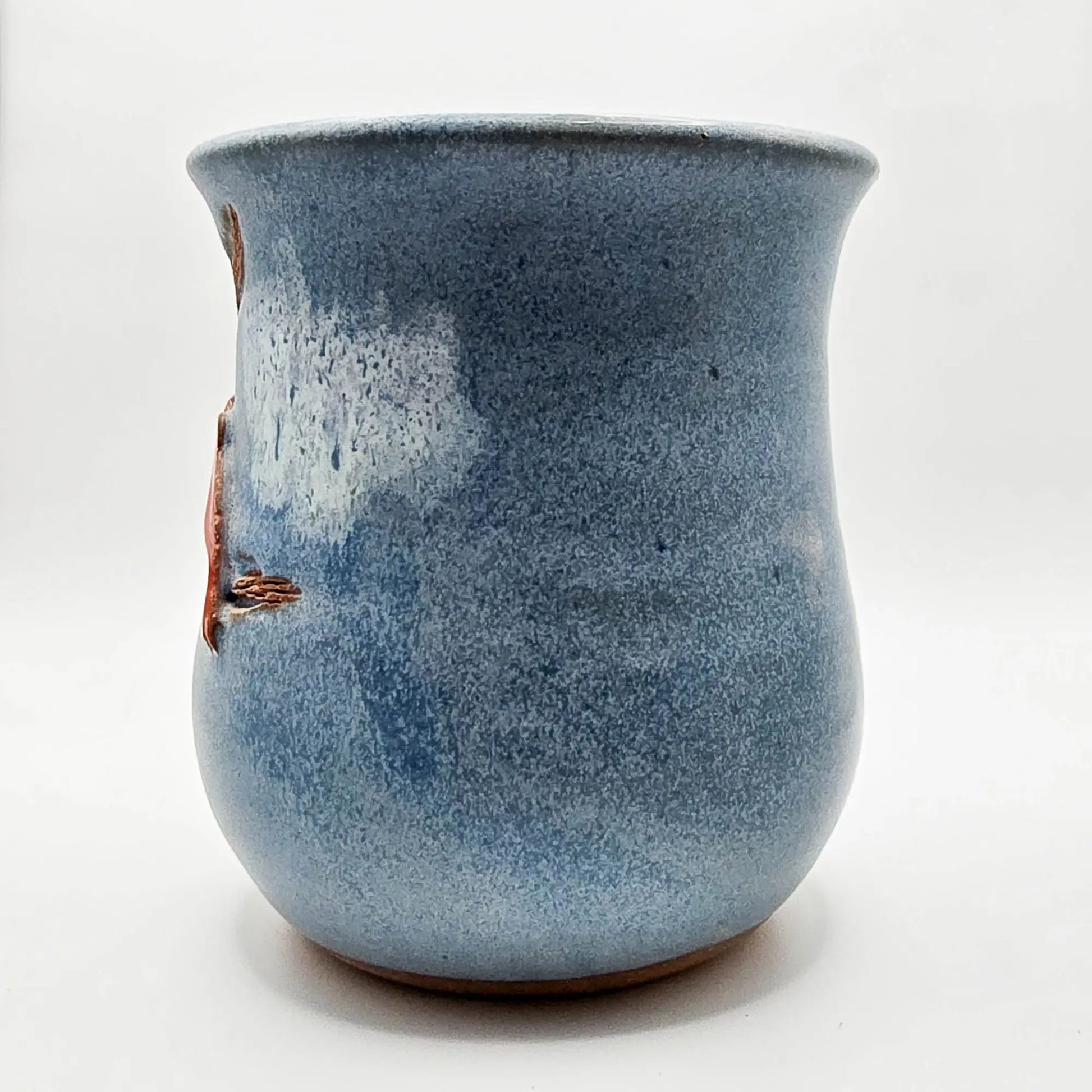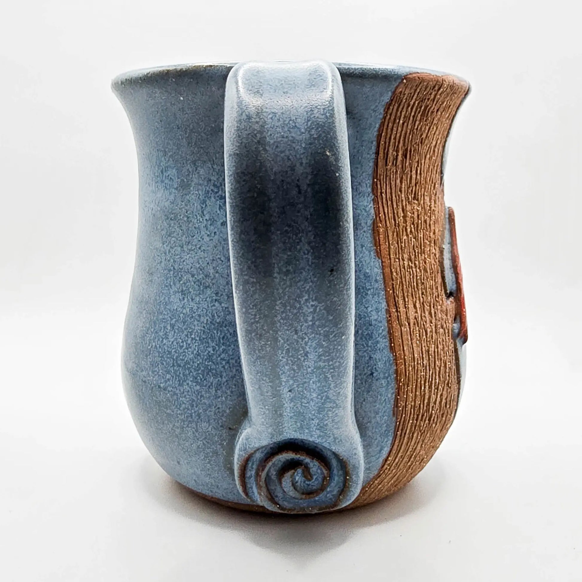 Check out this new adorable kissing love birds mug. Hand carved tree with 2 added love birds on a branch. Glazed in our beautiful williamsburg blue. Our mugs hold about 14 oz. It's about 4.5" but 5.5" with the handle. Everything is microwave, dishwasher, and food safe.