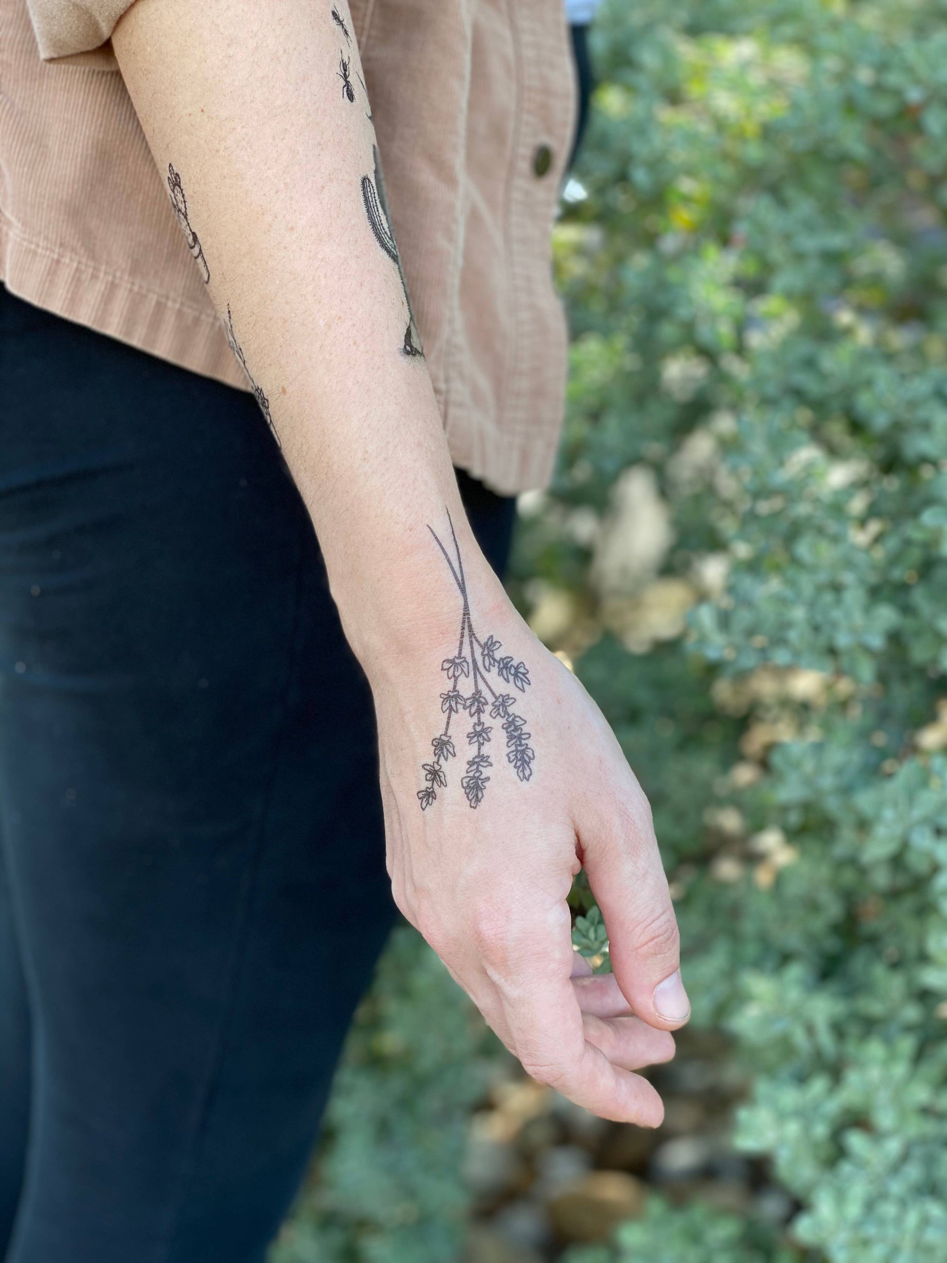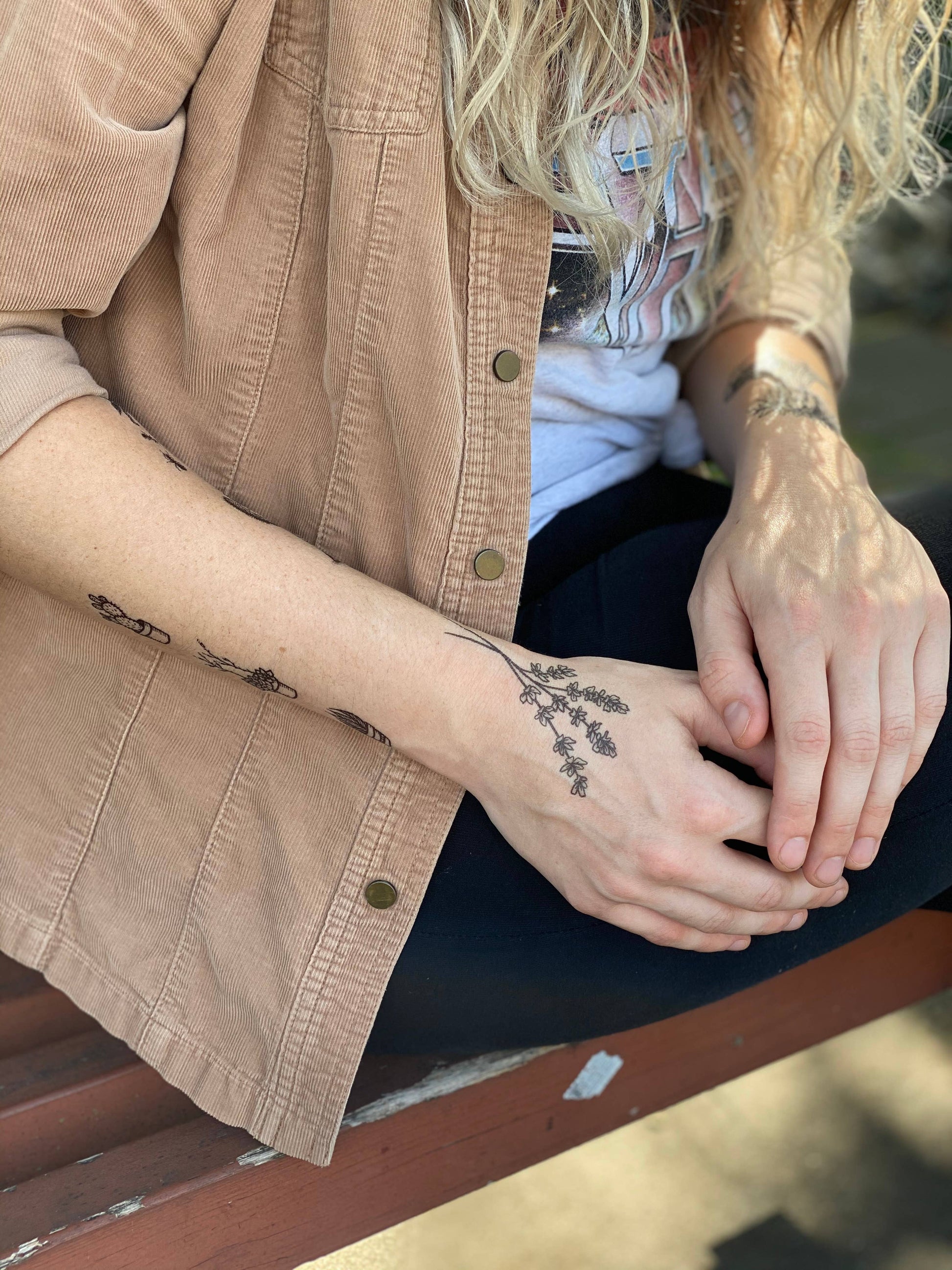 Lavender Twigs temporary tattoo. The lavender plant and its sweet floral scent is widely appreciated for its comforting nature. The gorgeous stalks of light purple petals radiate outward covering dark green foliage. Each of the 2 sheets of this original hand-drawn design includes 2 petite lavender twigs, so 4 total twigs. Each twig is about 3 inches long.