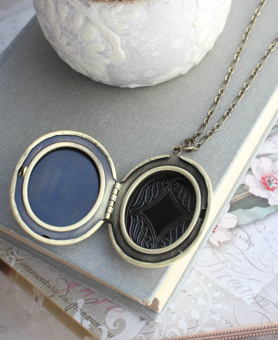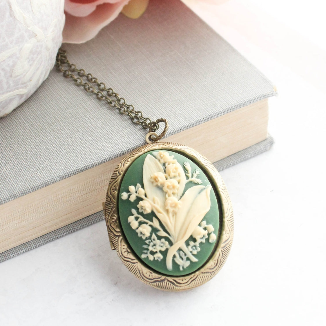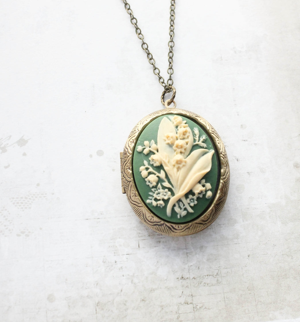 This is a large antiqued gold brass photo locket with a beautiful lily of the valley cameo in green and ivory cream. The locket measures 1.5"w x 1.75 "h (36mm x 45mm) and has two oval frames inside.