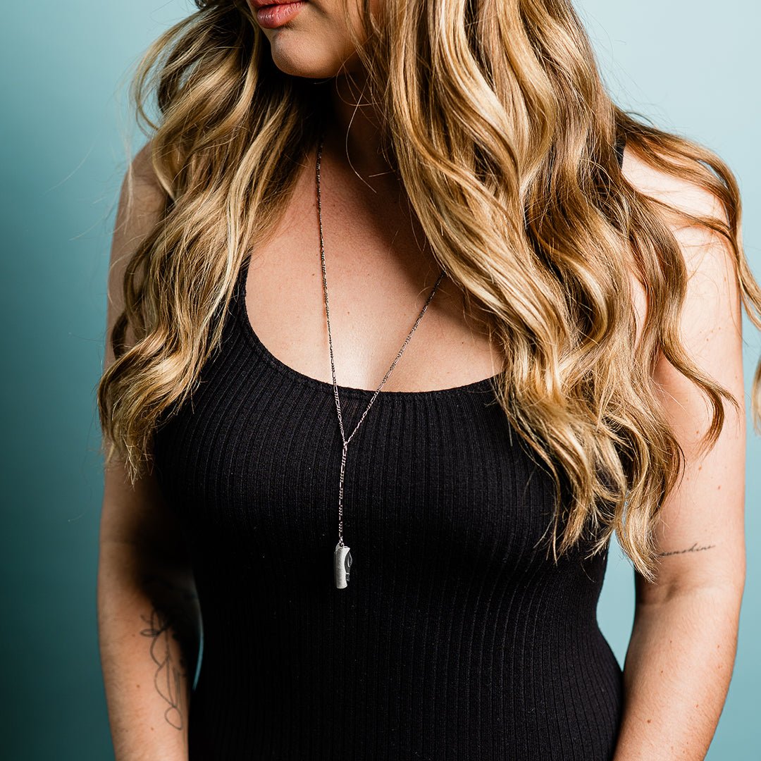 Small matte silver knife y-drop style on antique silver figaro chain.