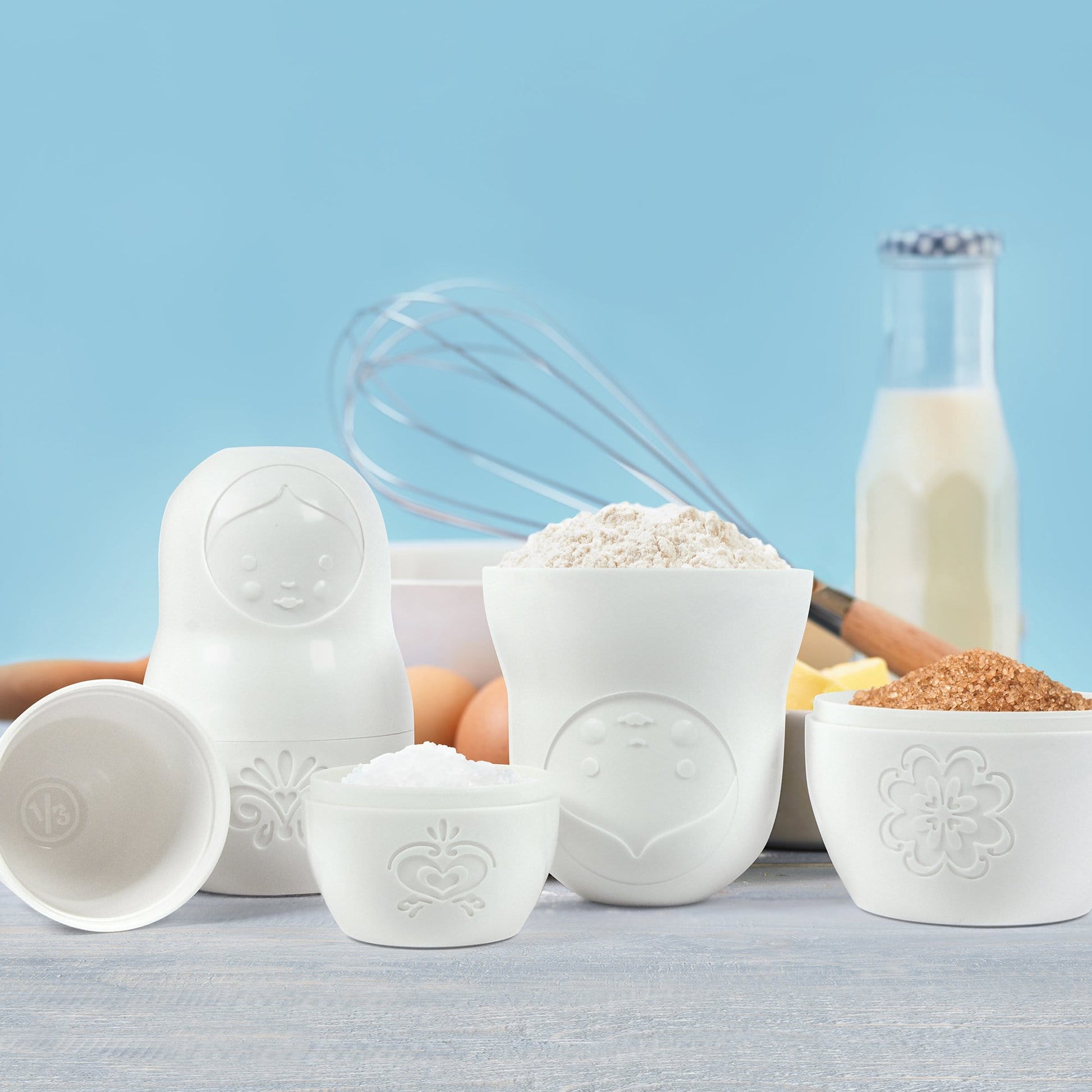 This set of six dry-measure cups nests neatly just like traditional Russian matryoshkas. They accurately measure 1/4, 1/3, 1/2, 2/3, 3/4 and 1 full cup, and they're built from heavy-duty, food-safe, long-life engineered plastics. M-Cups are useful, easy to store, and quite charming... so why not doll up YOUR kitchen with a little Russian folklore?
