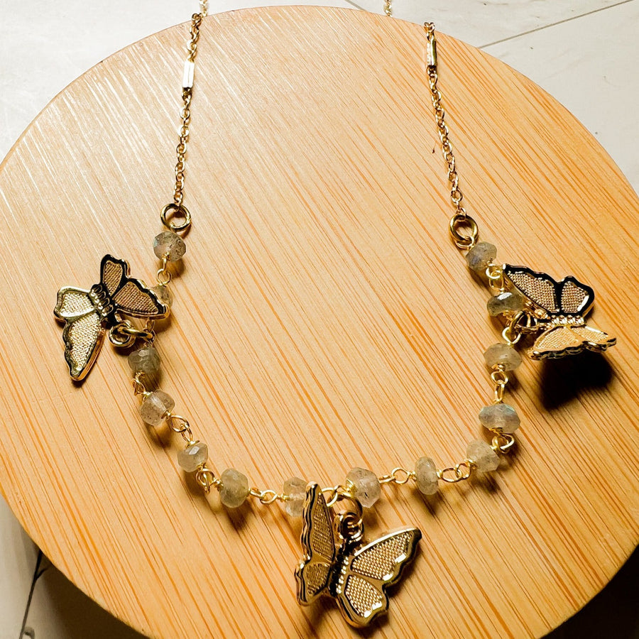 Three butterflies flying together is said to represent luck. Anyone with the good fortune to wear or receive this beautiful necklace will love its lightweight feel and whimsical vibe. The gemstone chain is designed to hang just below the collar bone and the butterflies are evenly spaced apart. The necklace is then completed with our specialty gold plated brass chain and an extender at the back.