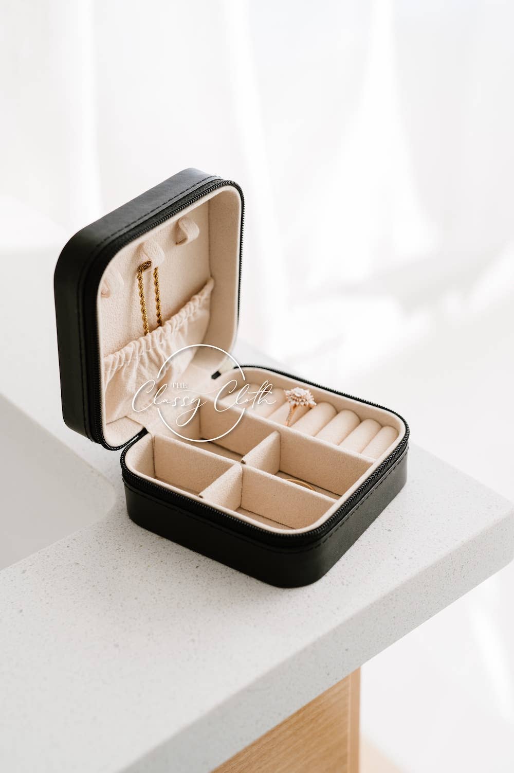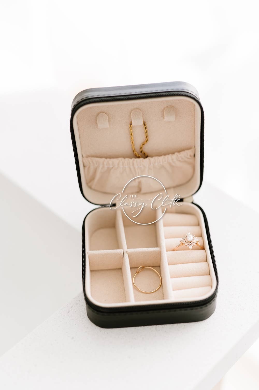 Here's the perfect solution to jewelry organization on the go! Our Mini Jewelry Case is made of high quality polyurethane, with an internal pouch, necklace hooks, quad compartments, and ring & earring slots—boom! All your jewelry is now ready for travel and totally organized. Go forth and sparkle!