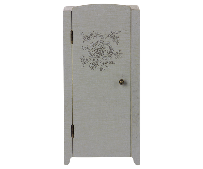 This vintage-looking closet has a beautiful embossed flower print on the front and beautifully printed wallpaper inside. The shelves inside will make sure the organizing play will begin. This closet fits into the Maileg dollhouse.