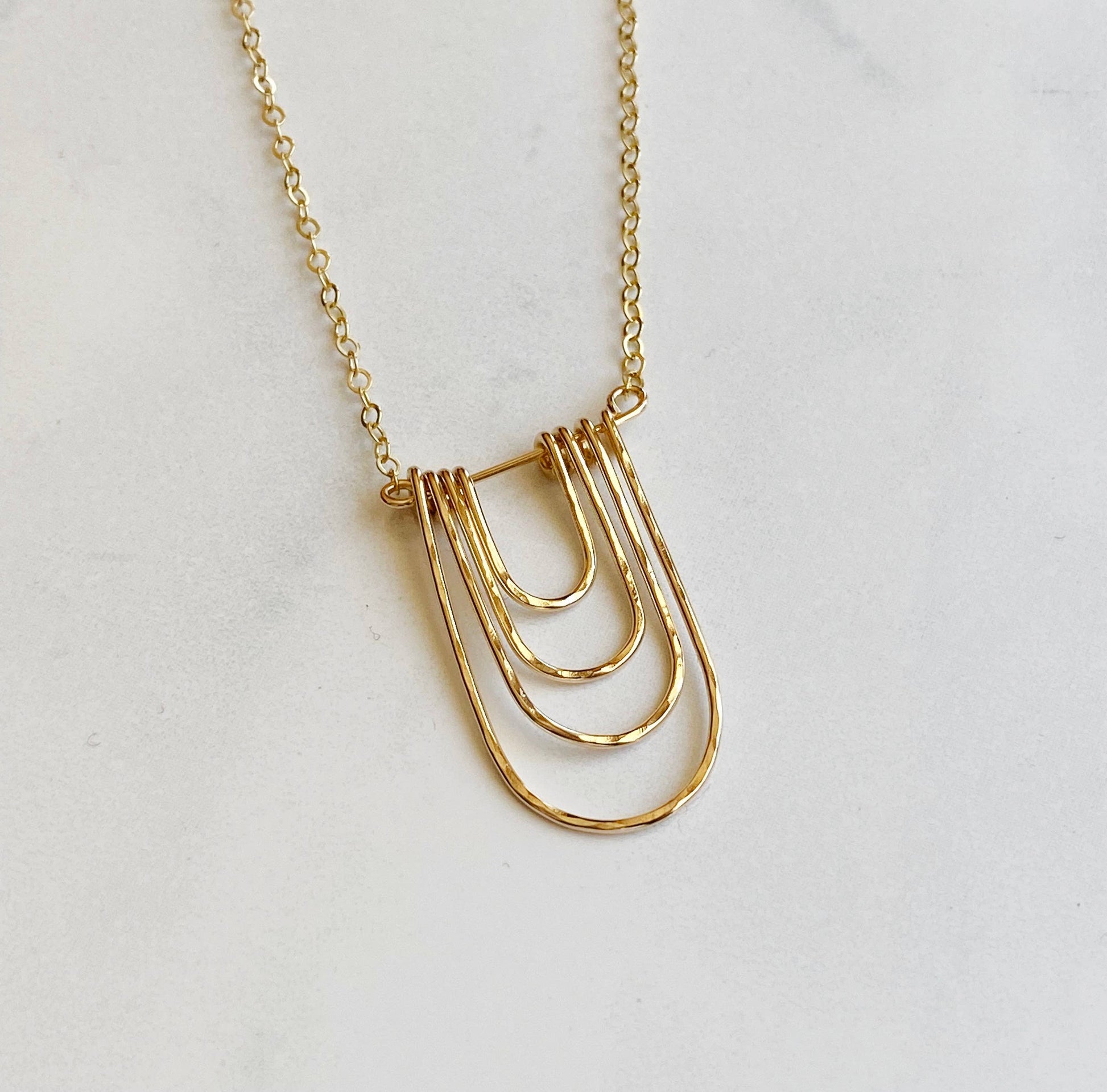 This super cool necklace is very flattering on the wearer. It features 4 staggered hand forged arc shapes that swing on a horizontal bar. They are hand forged from 14kt gold filled wire and hammered with a dappled texture to catch the light. The chain is 14kt gold filled fine cable chain. The necklace is 16.5 and is finished with a spring ring clasp and my signature large end ring.