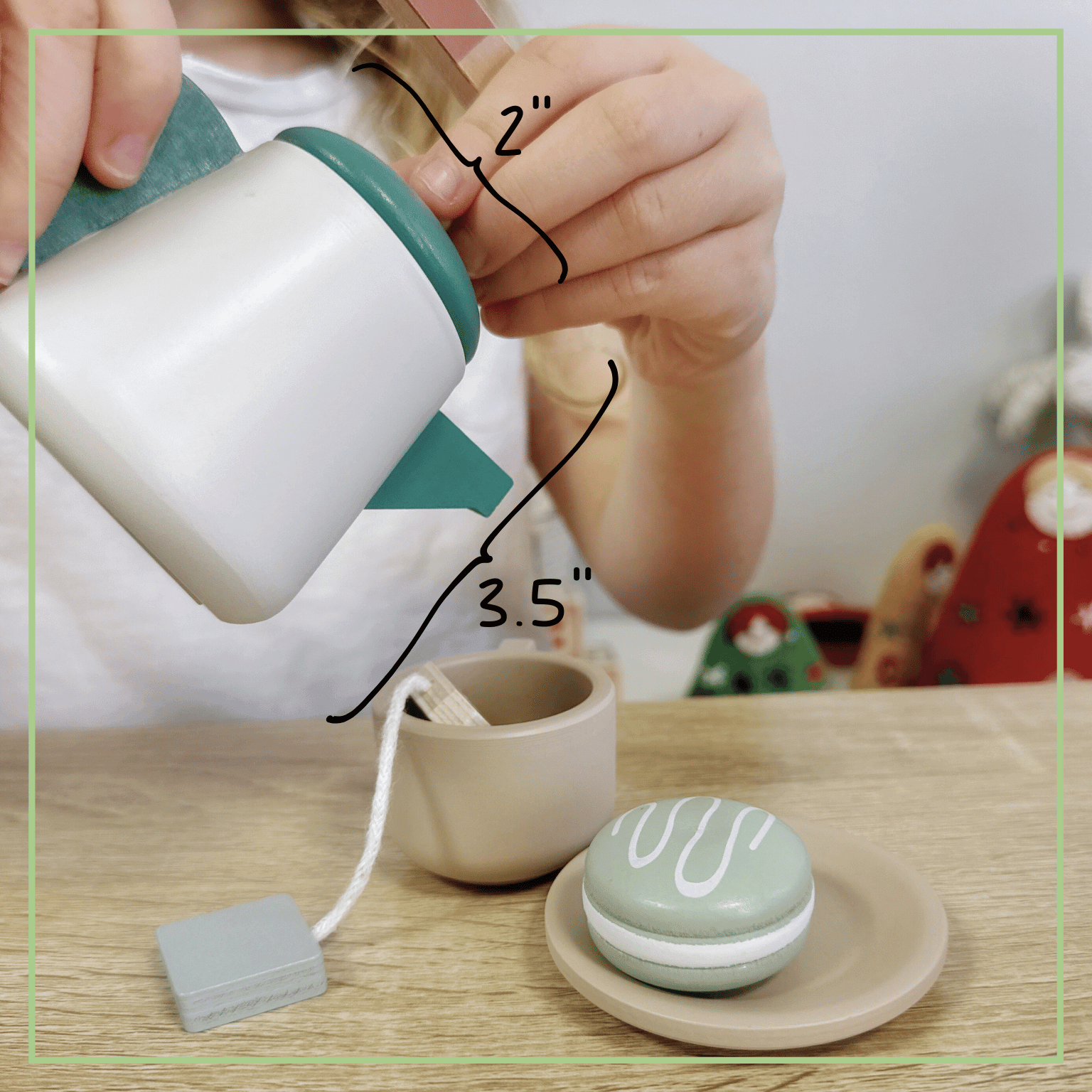 Your Tea Party Includes:* 2 wooden teacups * 2 dainty spoons * 1 graceful teapot * 1 classic kettle * 5 tea bags in storage box * 2 wooden macarons * 1 serving plate * 1 carrying tray * Perfect for sharing