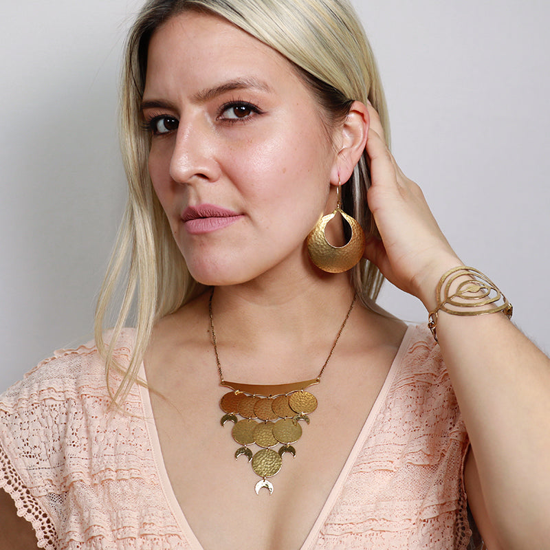 Cascading hammered circles and moon shapes on an antique gold figaro chain.