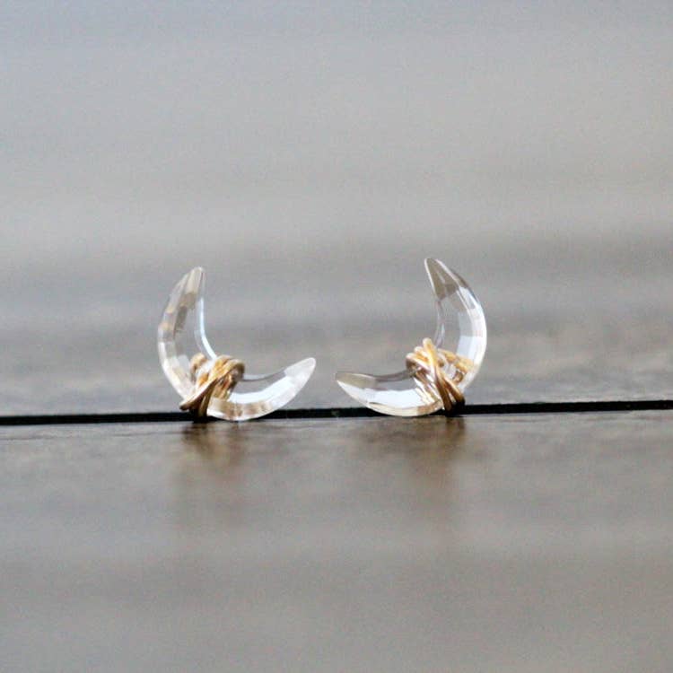 These gorgeous studs are bound to become your favorites! Natural Crystal Quartz gemstones have been custom-cut into modern faceted crescent moons, and securely wrapped into place in Saresssa Design's original style to create a unique and edgy pair of studs you'll love wearing. The stones can be worn in your first ear piercings, or your second if you prefer an ear climber look!