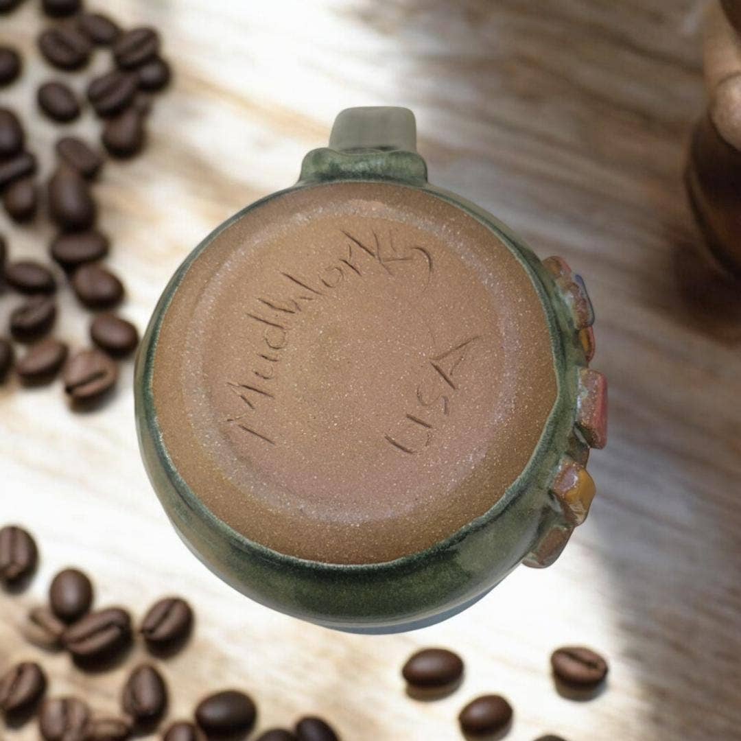 All of our mugs are hand-thrown in stoneware clay and hand-painted. This piece was hand-dipped in our lead free spring glaze. It holds approximately 14 fluid ounces. As this item is hand-made , please understand no two mugs will be exactly alike. That is the special nature of handcrafted goods!