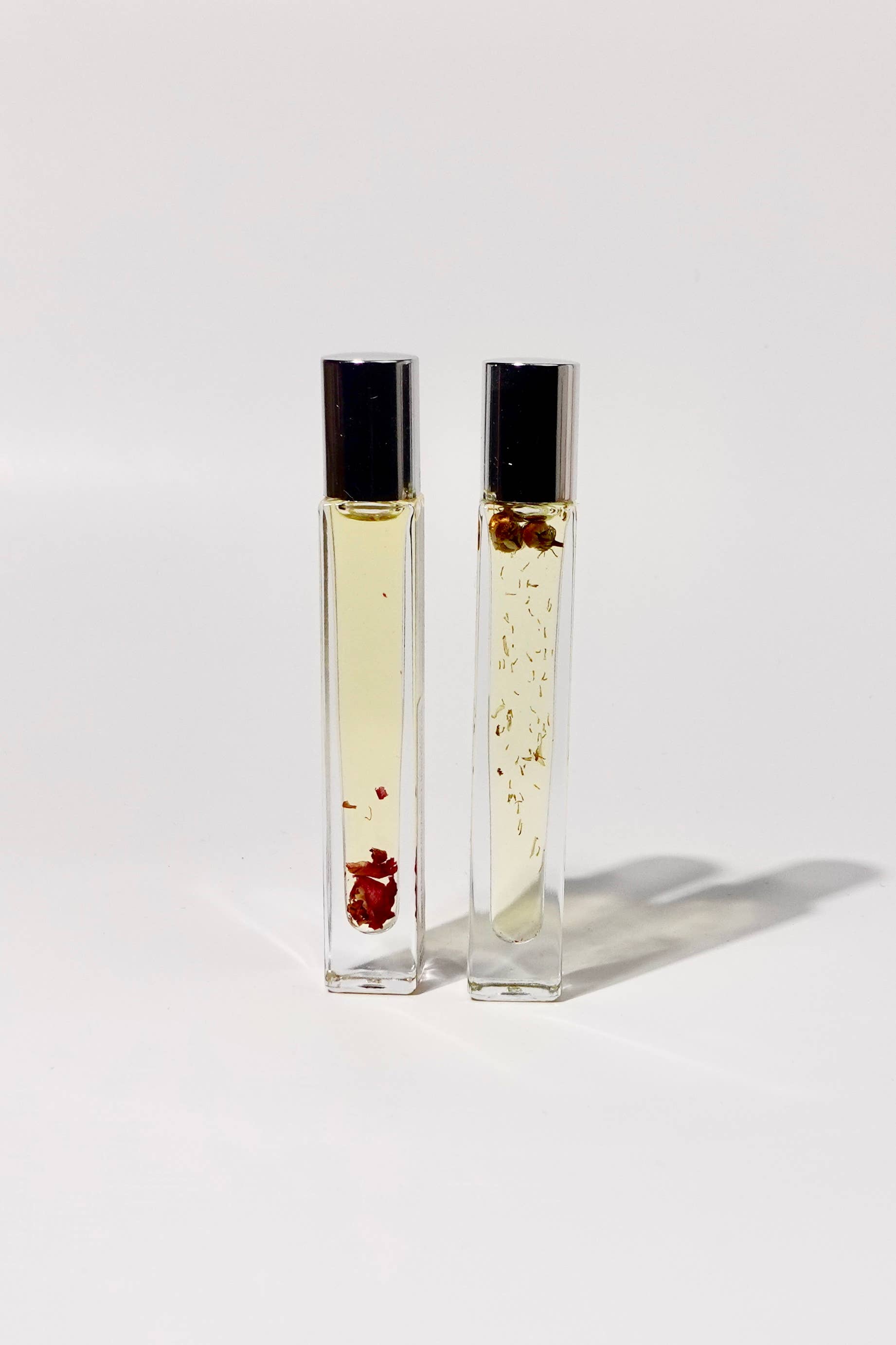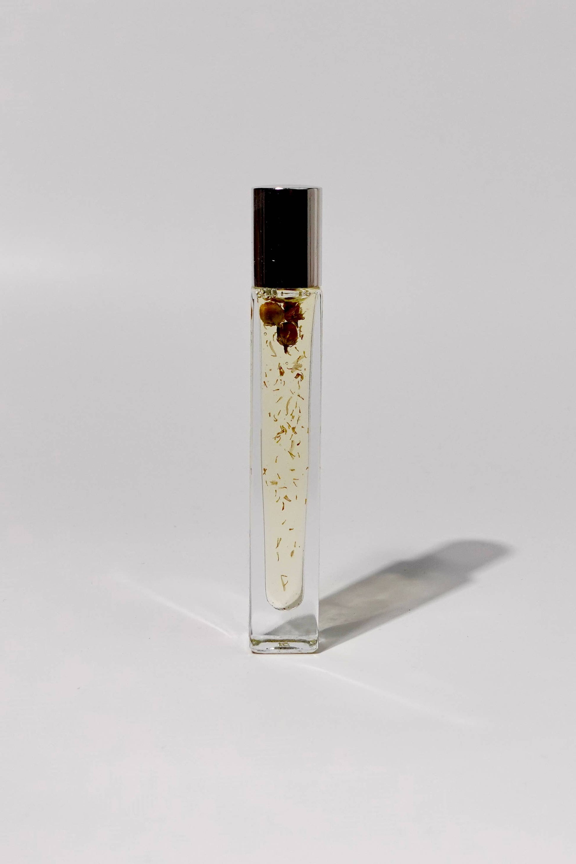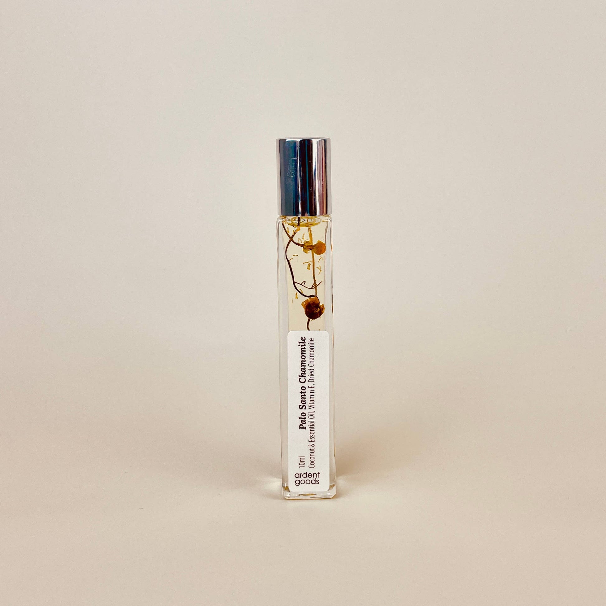 Natural ingredients in a convenient glass roller container. Made in small batches of Coconut Oil, Vitamin E, Palo Santo Essential Oil and Chamomile Flowers .35 ml