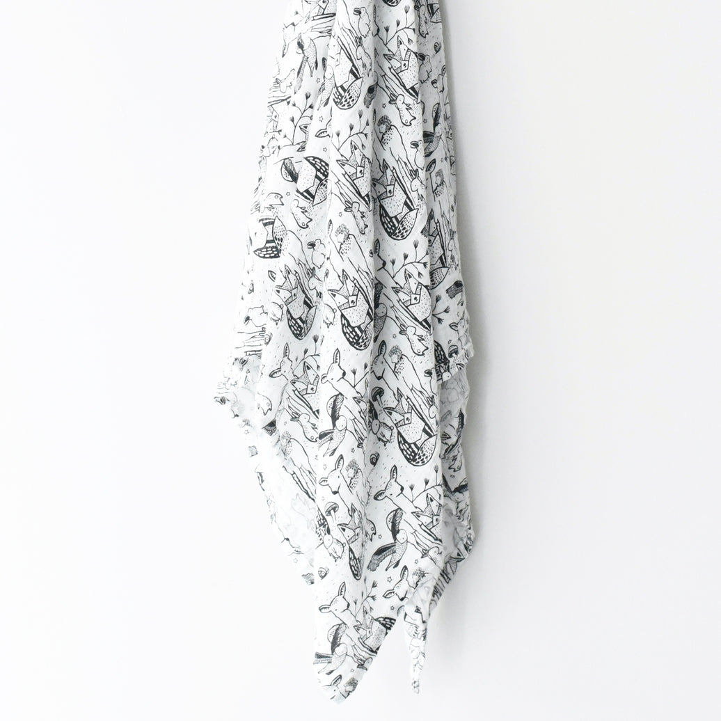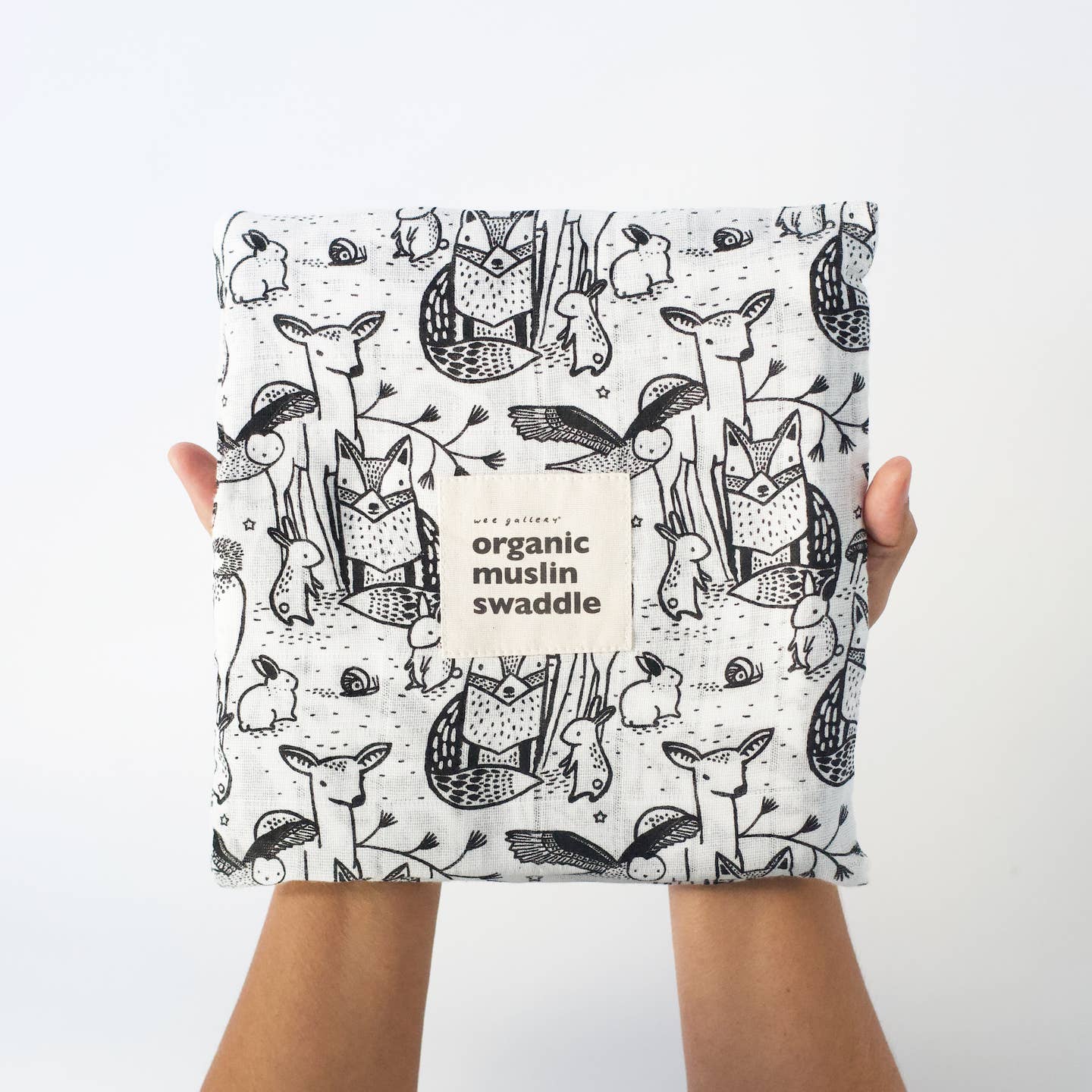 Our eco-friendly organic muslin Swaddles make baby, mom, and planet happy! These soft baby wraps are generously sized to be versatile enough as a swaddle blanket or stroller cover, and in the car seat, crib or changing table. Made in India using organic fabric and sustainable practices. Sure to become your go-to baby gift because of its lovely packaging and high quality. Baby will love looking at the hand illustrated high-contrast woodland/forest animals pattern, and snuggling in the soft organic cotton. Each blanket measures 48x48 inches. Made of: Organic Cotton Muslin