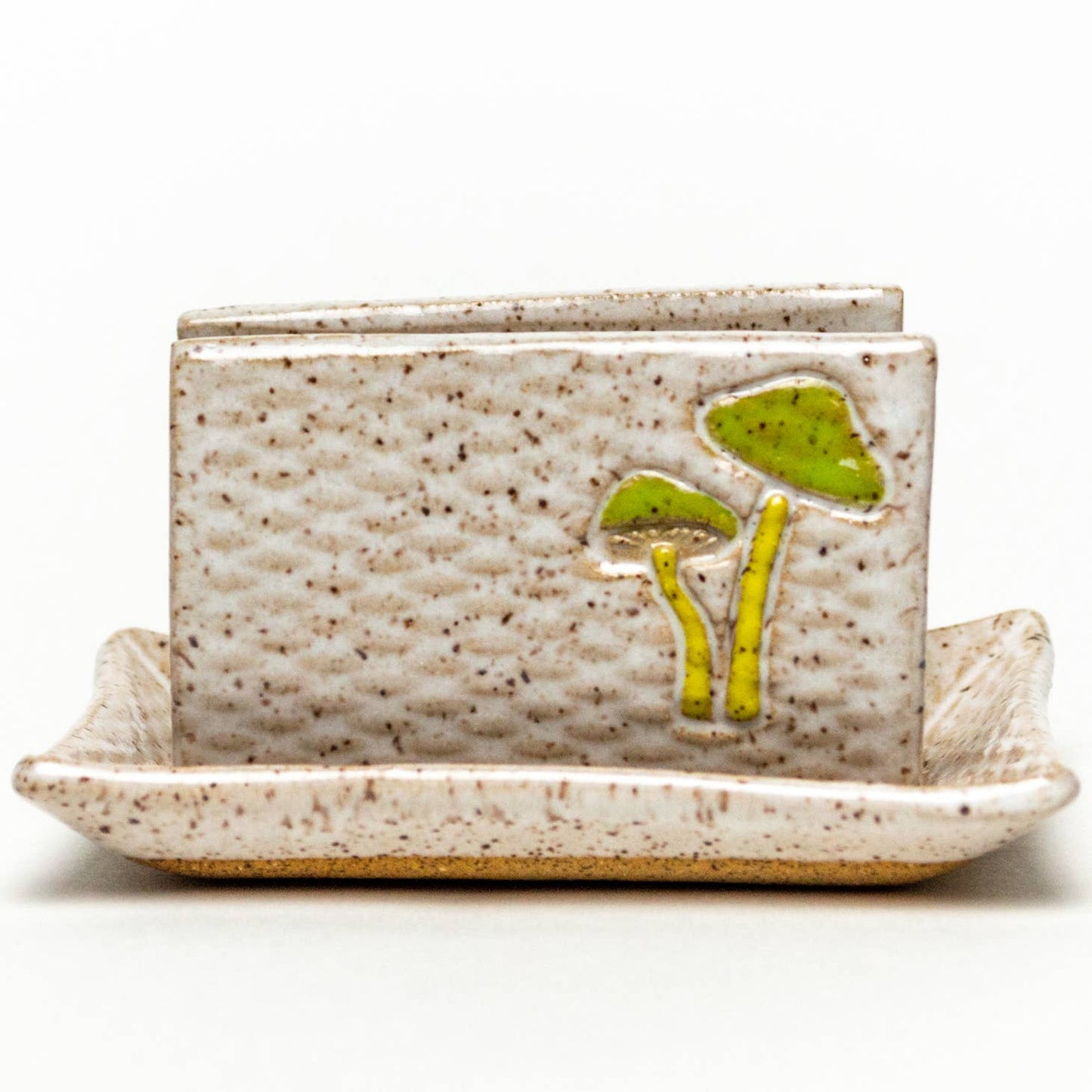This beautiful stoneware ceramic mushroom design white sponge holder is hand-built and hand-glazed in Ohio, USA.