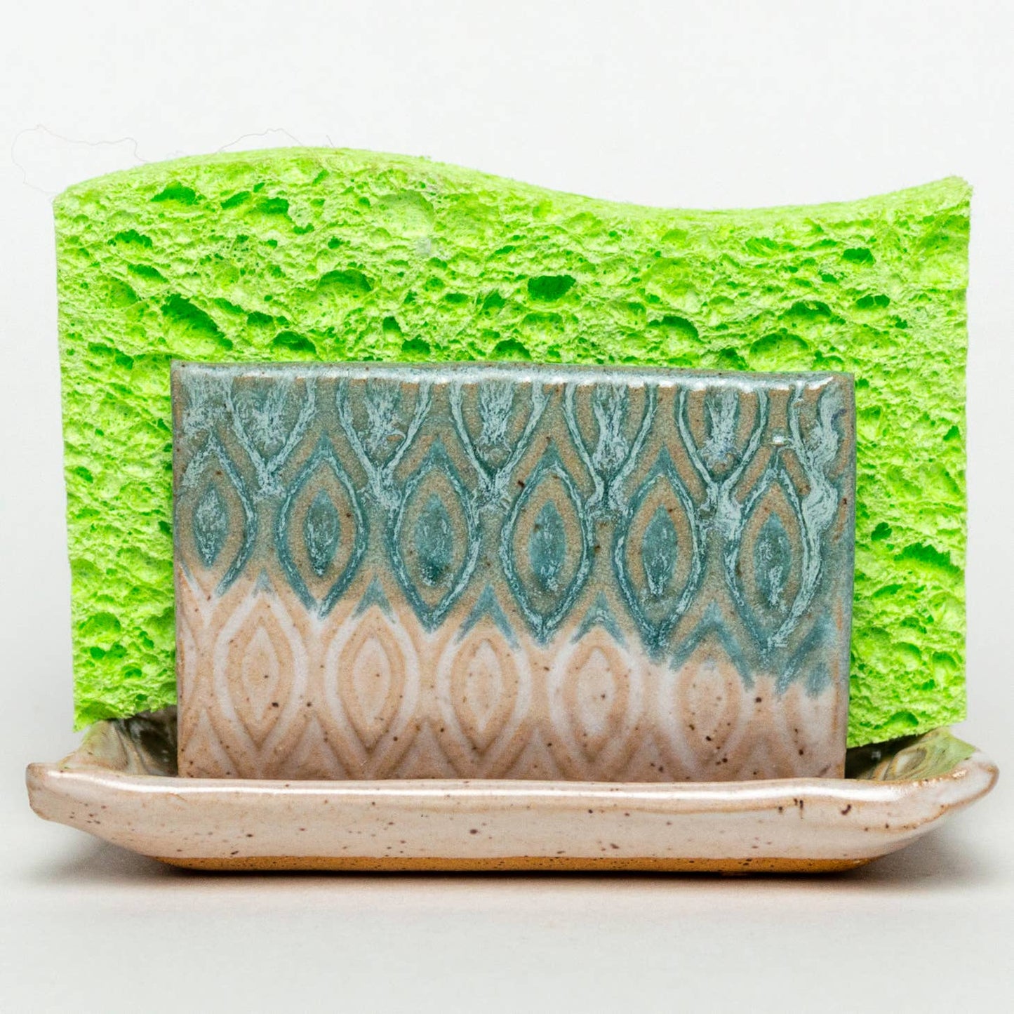 This beautiful stoneware ceramic patterned green and white sponge holder is hand-built and hand-glazed in Ohio, by kim or jack.