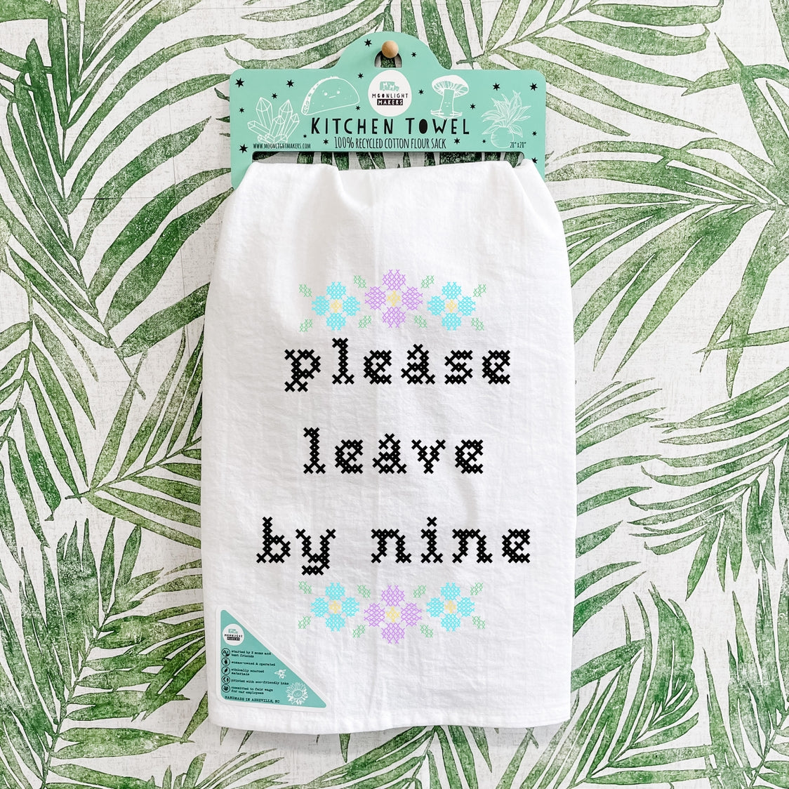 All of our full-color dish towels are white 100% cotton flour sack towels. They are screen printed with Moonlight Makers original designs using non-toxic ink. Unfolded size: 28"x28". Our products are all handmade in our downtown Asheville, NC Studio/ Gift Market.