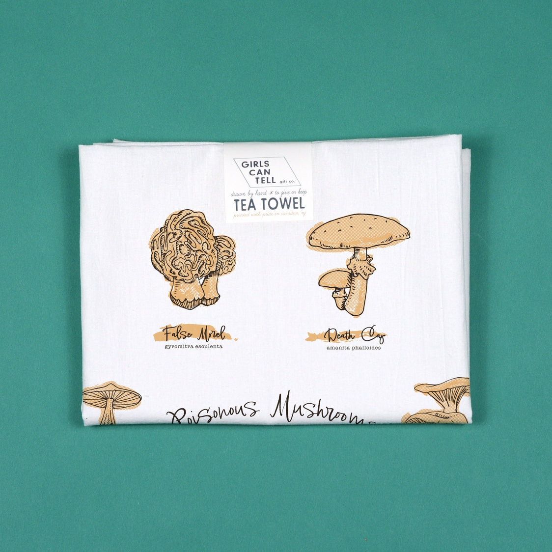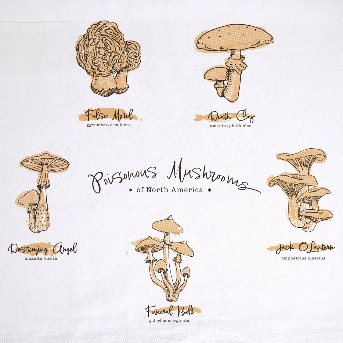 Part of our mushroom collection, this tea towel showcases some of the poisonous mushrooms you might find foraging in the forests and woodlands of North America. Do not collect, though! Several of these mushrooms are deadly poisonous.