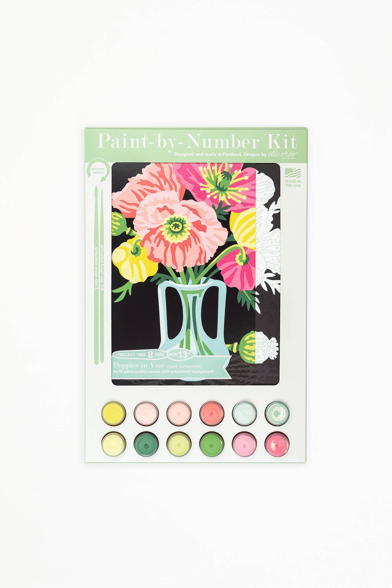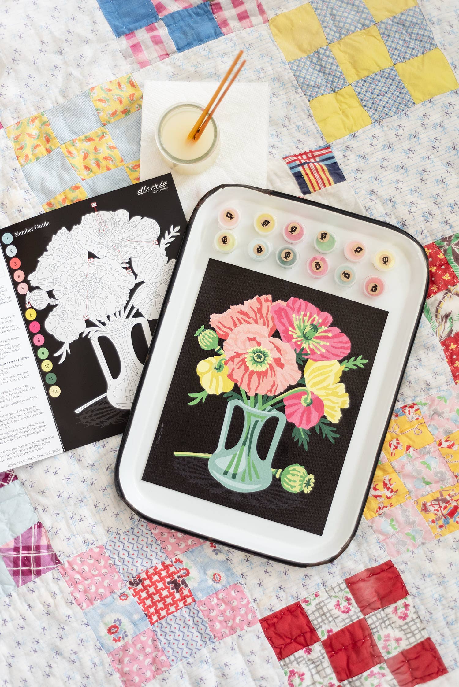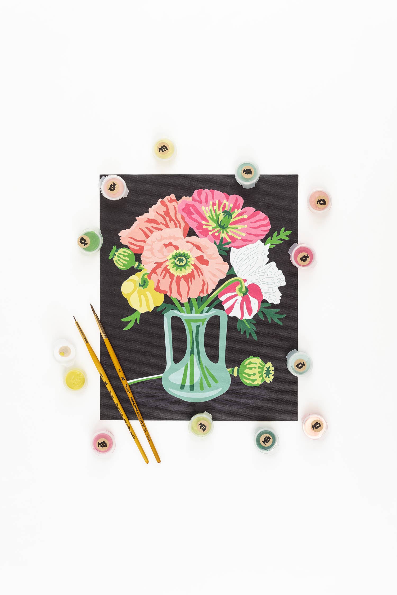 Poppies in Vase paint-by-number kit features beautiful Icelandic poppies in a blue glass vase. The preprinted background features a subtle lace doily design on a rich black background.