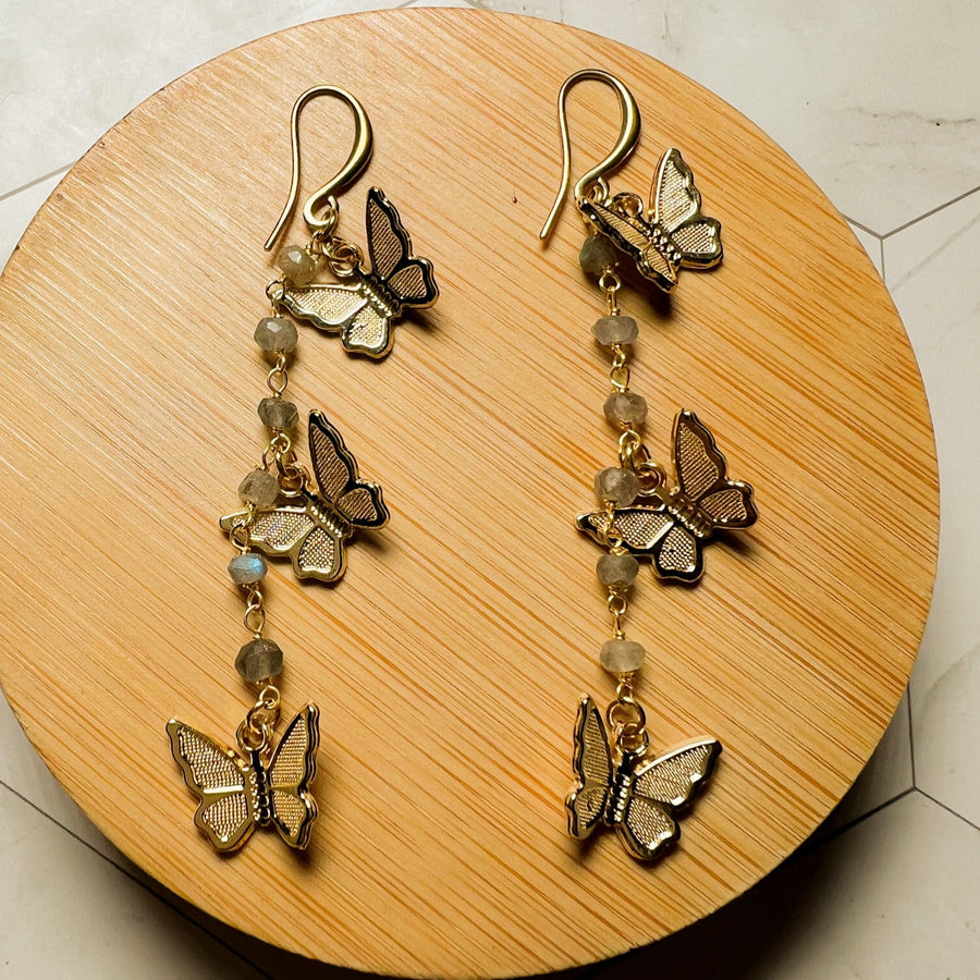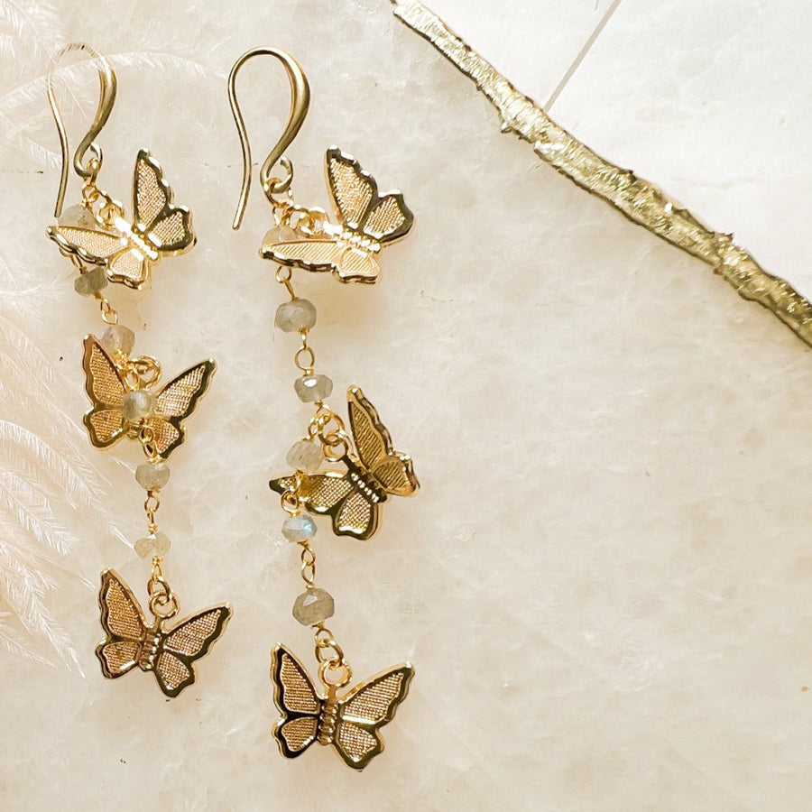 On the Western coast of the US, Monarch Butterflies migrate from the north to south and back. Along the way they rest in Eucalyptus groves and hang in clusters amongst the trees. The Psyche Earrings have 3 dainty golden butterflies hanging on a cluster of gemstone chain. This style is enchanting as the magnificence butterflies in the canopy.
